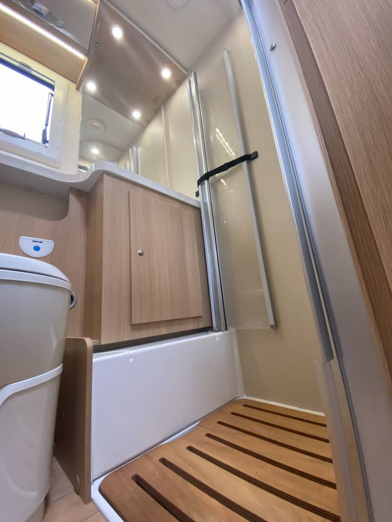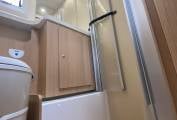 Washroom: A smart, functional design featuring separate shower with concertina door, toile, basin with storage-window and good lighting - remarkable for the vehicles compact footprint.