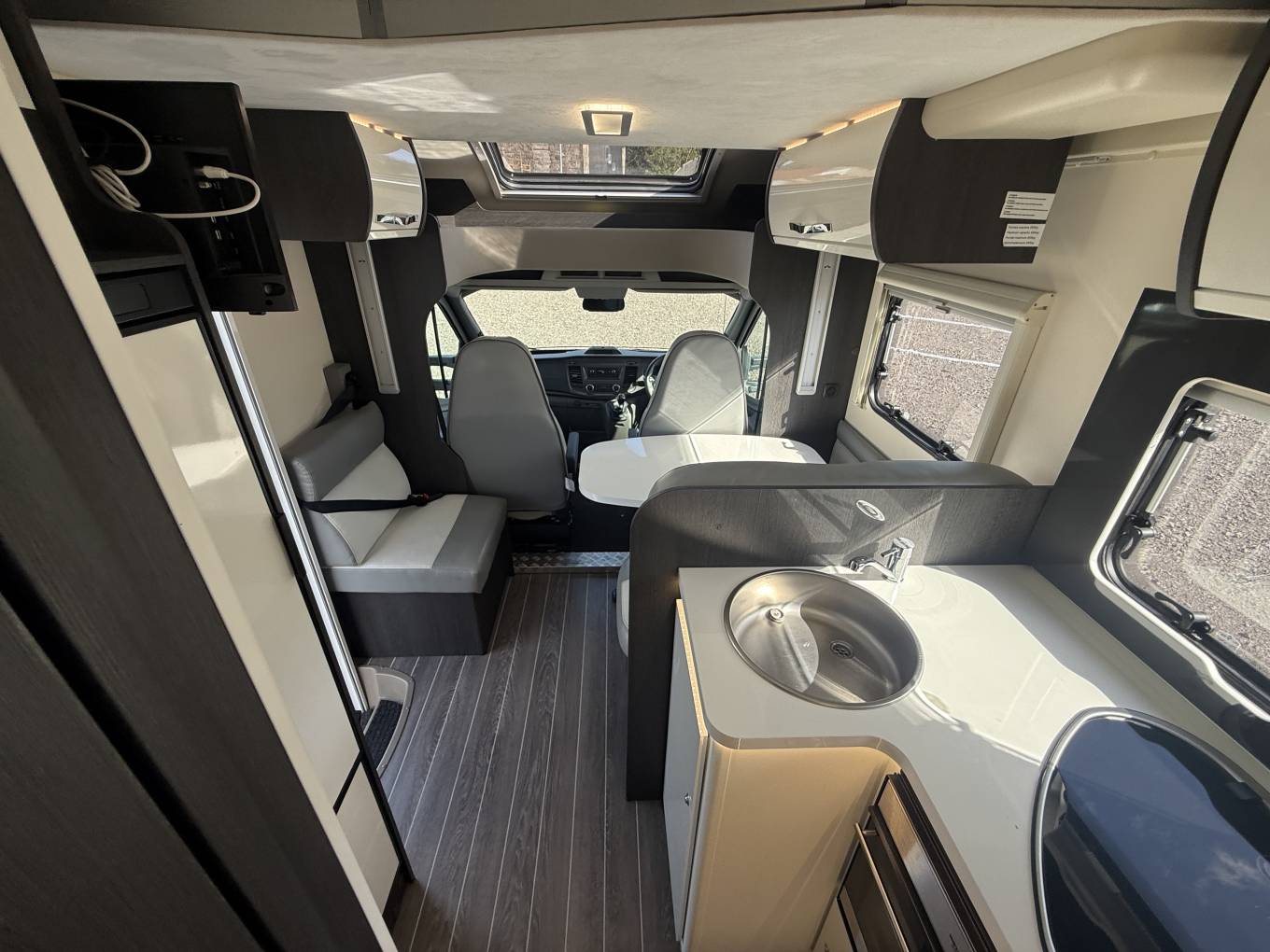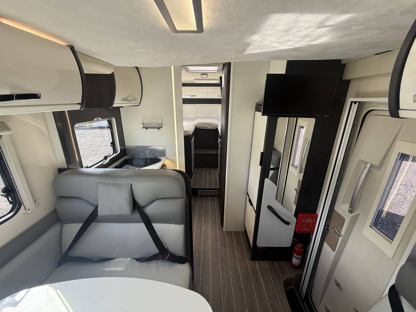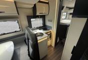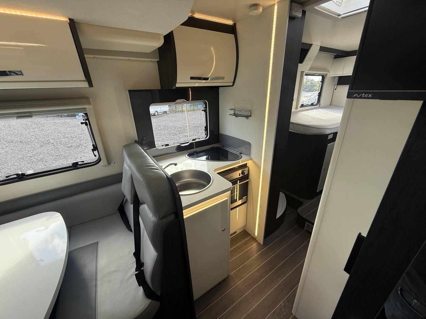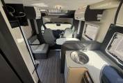 The layout is as you enter the vehicle you are greeted with smooth Italian styling and above is the drop down bed which is electric powered and boasts enough space for two adults. The kitchen comes fully equipped with 3 Gas burners, a full sized 3-way Fridge and Freezer, a sink and then plenty of worktop space and storage. The modern and light lounge and living area has a lounge with an adjustable centre dinette table, and plenty of space for the family to dine in peace. All of this is complimented by stunning lighting and undercounter LED Lights to give you that luxurious feeling.
