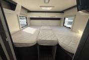 The Zefiro 685 is known for its rear bedroom with a fixed large bed area that can be made up of 2 single beds or one large king size bed over a large garage the full width of the motorhome with a modern and light front lounge and kitchen area.