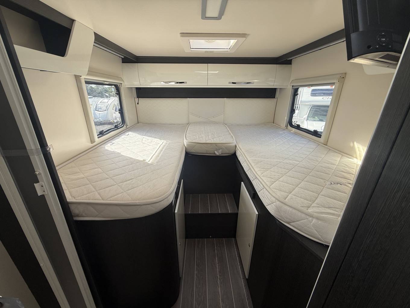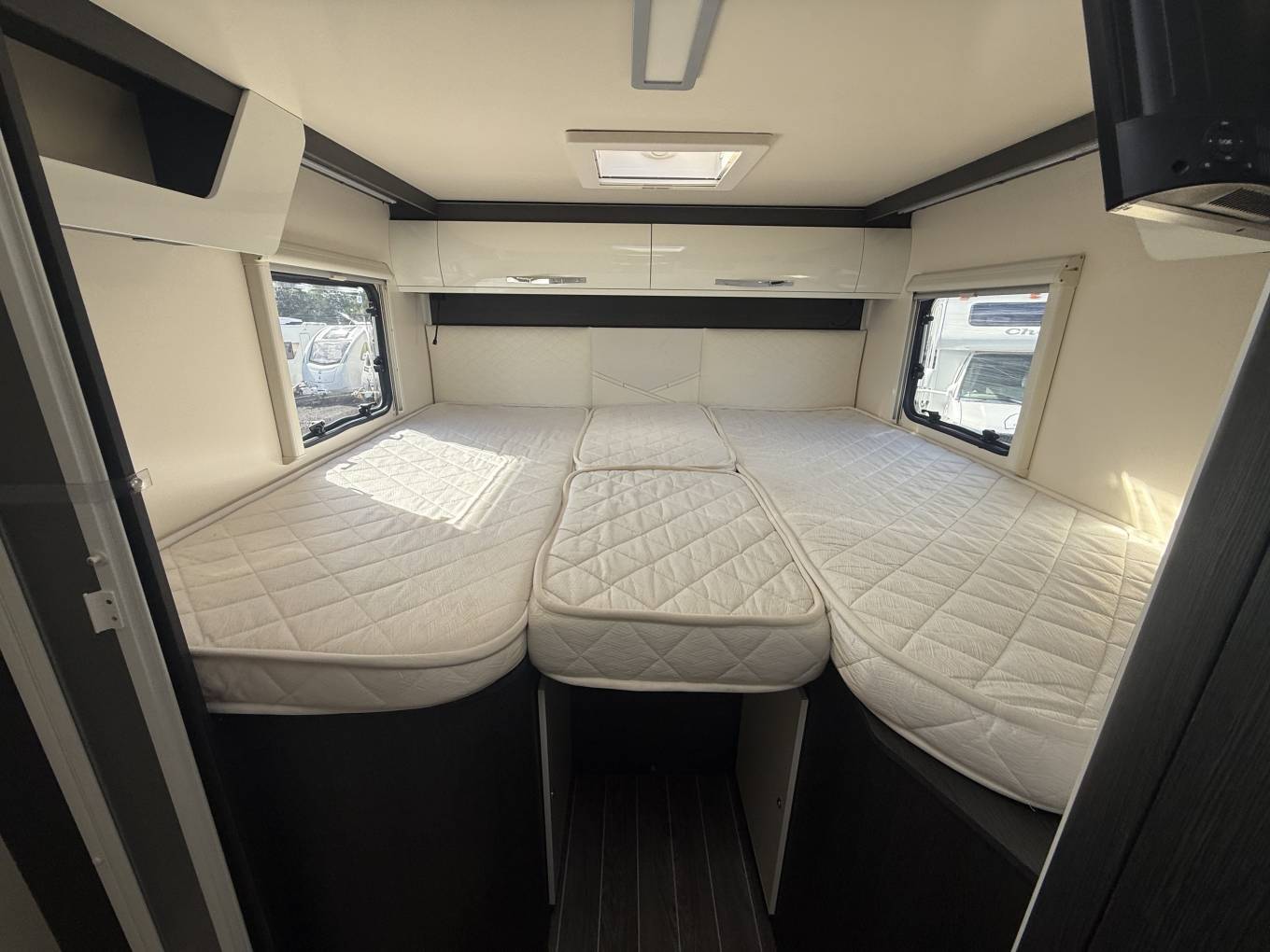 This motorhome has been fitted with extras including Reversing Camera, 2 Avtex TV's, VisionPlus Aerial, Vechline Solar Panel, Full Cab Concertina Cab Blinds, WIFI Box, and 4 Bike Rack.