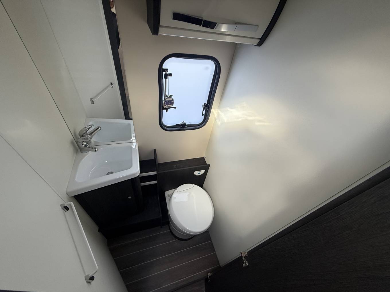 The rear of this vehicle is where luxury meets style as the rear bedroom has comfortable mattresses on two large single beds or converted to a massive king size double bed and there is a modern bathroom with a separate spacious shower room sitting opposite. All of this is separated from the main living area with a privacy door.