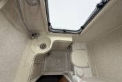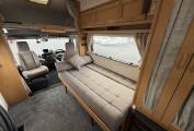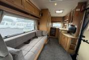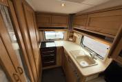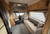 In the kitchen area there is good worktop and locker space which has a full cooker with a 4 burner gas hob, oven and grill, 3 way fridge, sink with drainer and mixer tap and a microwave. In the rear corner is a washroom including vanity sink, toilet and shower. There is a tall wardrobe with Gas fire underneath. Hot water is provided by a carver gas and 230v powered boiler. And there is a large over cab bed to give you the other sleeping area for 2 people.