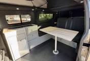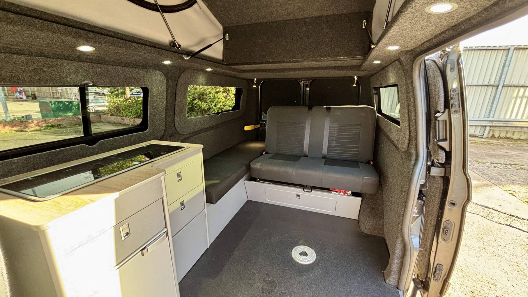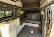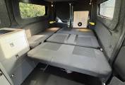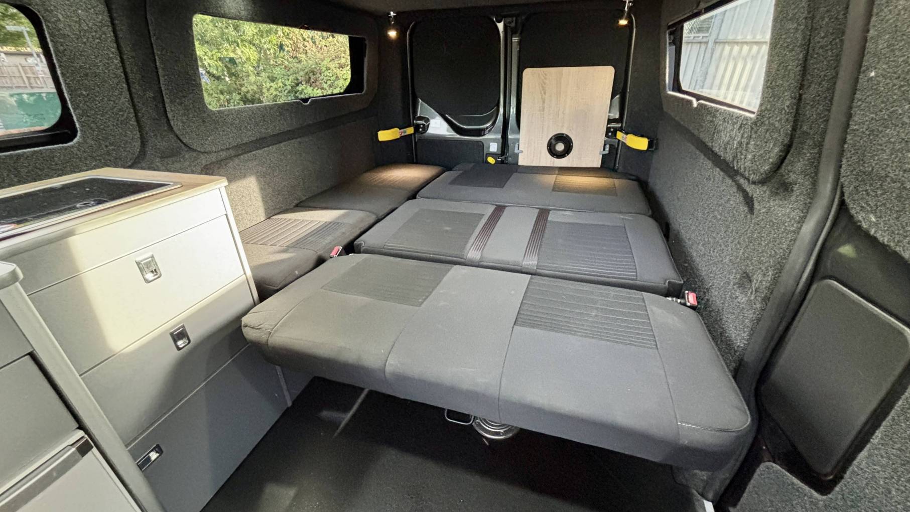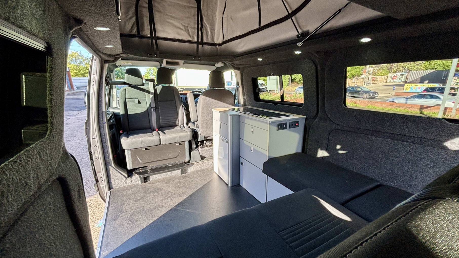 Inside, the Vandoc conversion with Skyline Scenic roof features a crash-tested Evolution 2 Smart Bed with 2 seat belts that folds into a comfortable double. Alongside it, a clever storage box with two matching cushions extends the sleeping area, creating an even larger bed. The pop-top roof provides sleeping for two more, making this a practical 4-berth camper with 5 travelling seats. Blackout blinds and LED roof lighting with a gel-polished black roof finish complete the cosy interior.