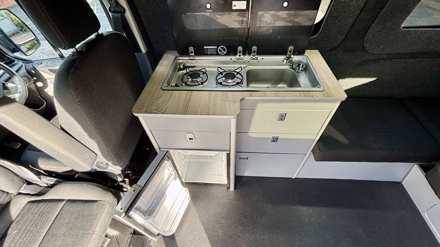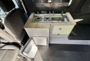 The EVO Design POD kitchen includes a 2-ring gas hob, sink with tap and water bottle kit, fridge, and ample storage. A removable table and double passenger swivel seat make for a flexible and social living space.