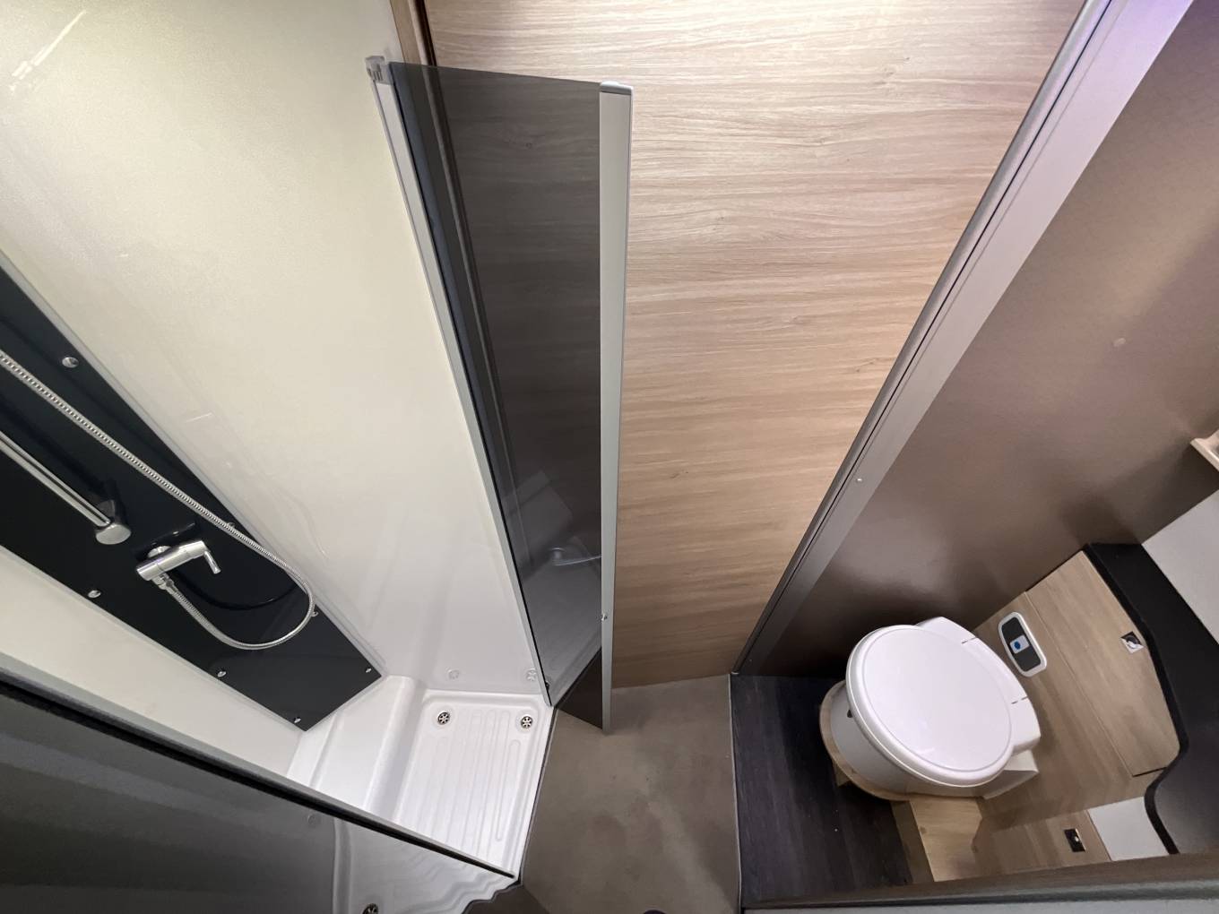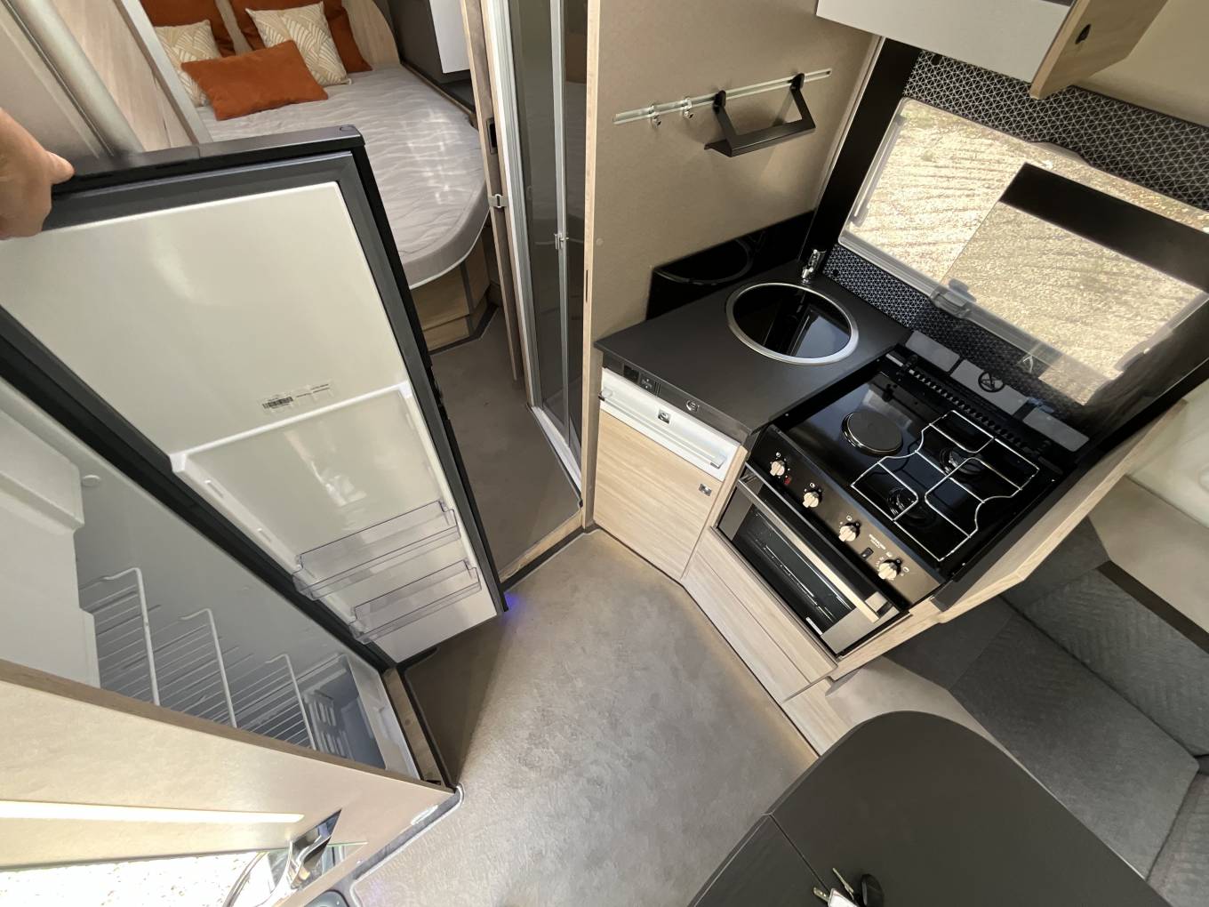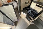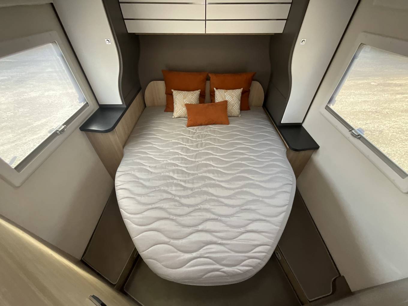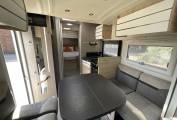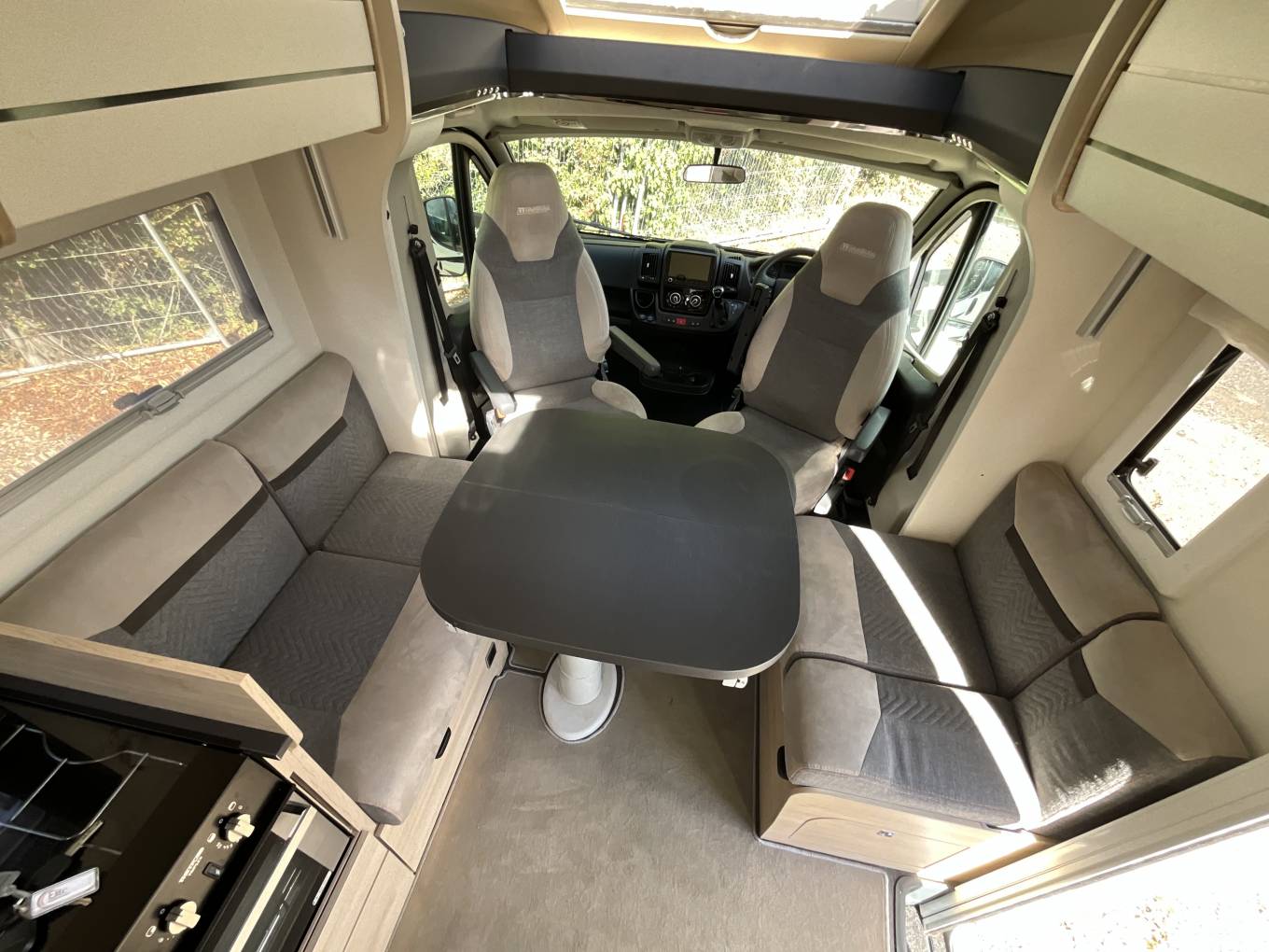 Starting at the rear of the motorhome you will find the popular double island bed which sits over a very large rear garage. This is height adjustable to vary garage space which can be accessed both internally or through large rear or side doors externally. Moving forward is the cleverly designed washroom which can be isolated from the front of the motorhome to create an en suite bedroom area. Here you will find a toilet with electric flush, wash basin with mixer tap, large mirror, storage and separate shower cubicle. Next is the well equipped kitchen including an oven and grill, 2 burner gas hob and electric hot plate, sink with mixer tap, large fridge with freezer compartment and plenty of storage. The living quarters are fitted with luxurious trimmings and fittings while the panoramic skylights and abundance of LED lighting give it a light and airy feel. This area has inward facing seats, 2 captain swivel seats and an adjustable table perfect for dining and relaxing watching your favourite TV show. The side bench seats also hide underneath them 2 forward facing, belted travel seats that can be folded up and out into position when required. Above the lounge is an electric drop-down double bed completing this 4 berth motorhome. Heating uses van fuel (diesel) and not gas and can be used whilst travelling so you arrive warm.