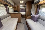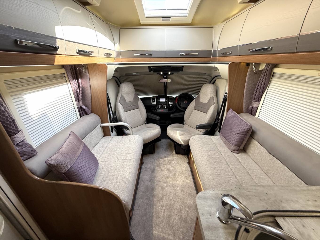 Here Twin Swivelling Cab Chairs turn to face Two Inward Facing Settees, and a drop down fitted Television with a DVD player hangs from the cab roof.