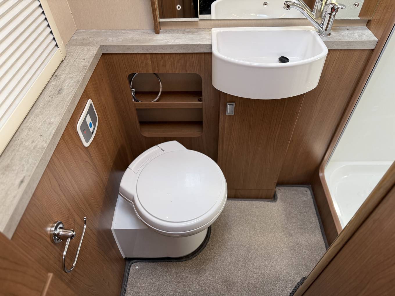 Here you will a Thetford Flushing Cassette Toilet, a Wash Handbasin, plenty of cupboards and a very large Shower Cubicle.