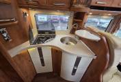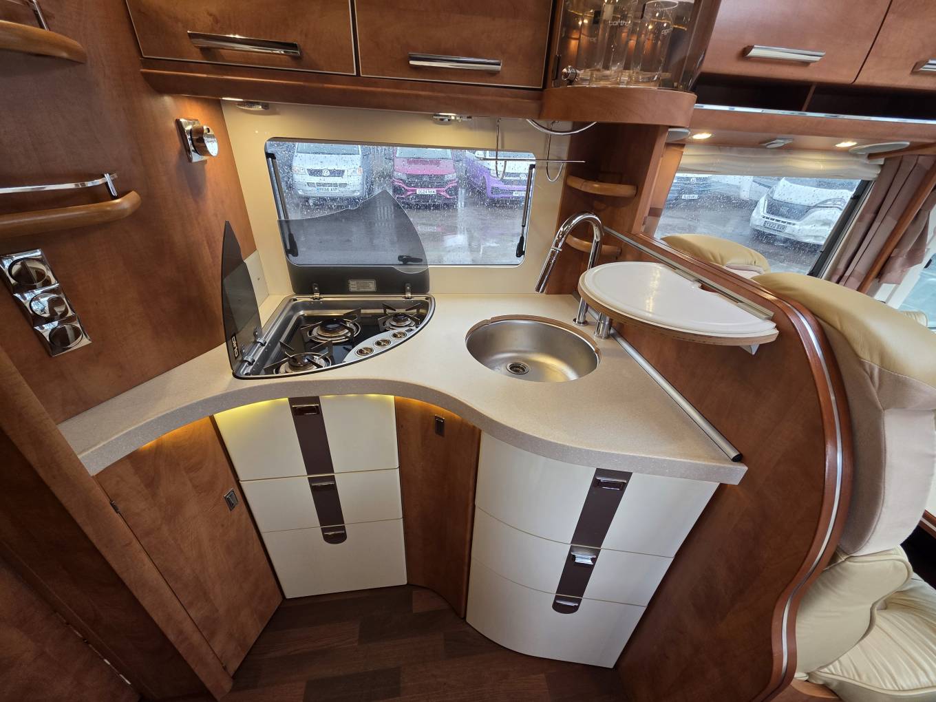 This comes with a fully equipped kitchen such as a three burner gas hob, luxury Carthargo glass carrier, fridge freezer, sink, and a coffee machine which has its own holder in the cabinet for when you are traveling.