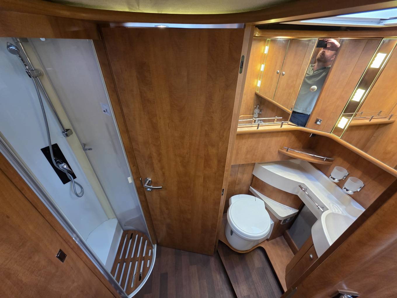 The toilet and shower come separate and sit adjacent from one another, so you have enough space in both to be comfortable. The door closes off from the front of the cab for a bit of privacy.