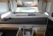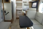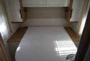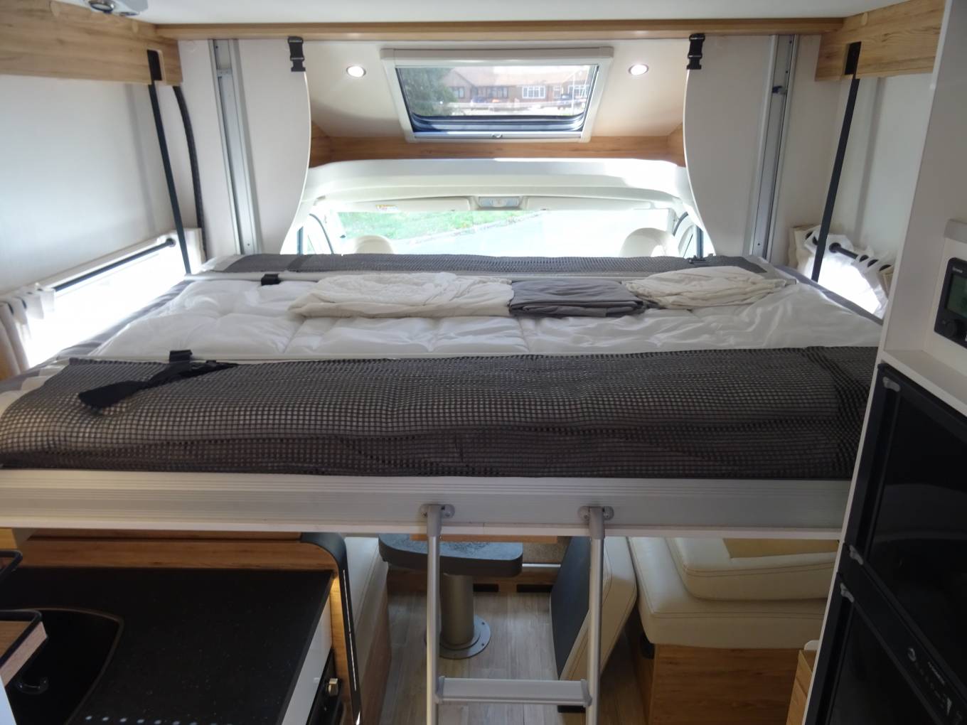 Both Cab seats swivel making the leatherette lounge/diner a truly luxurious and comfortable area to relax in. The electric over lounge drop down bed is available if needed. Another double bed can be made up below this for sleeping occasional guests.
