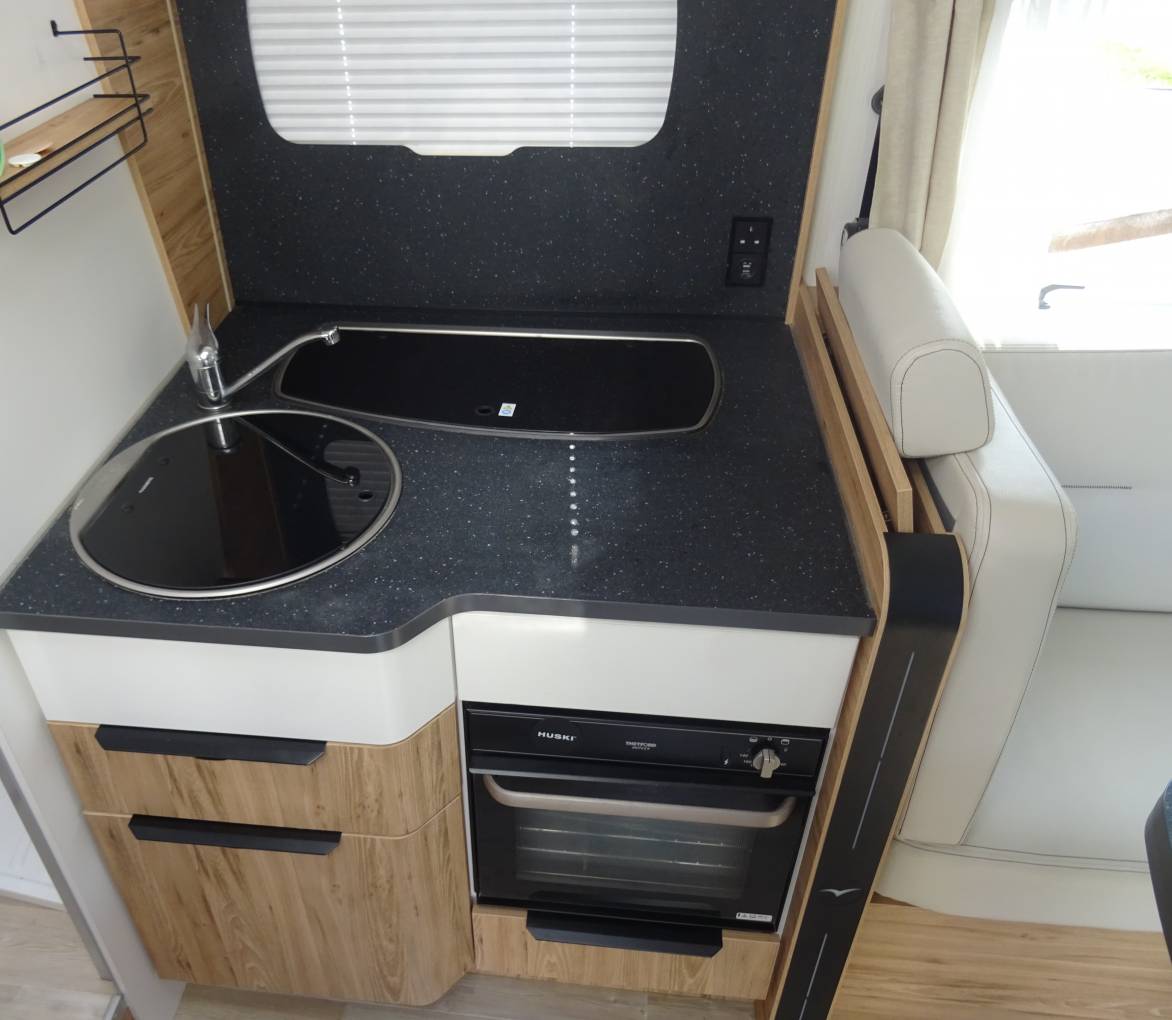 The mid kitchen is well equipped with all the necessary facilities including a full length Dometic 3 Way Fridge Freezer with automatic selection.