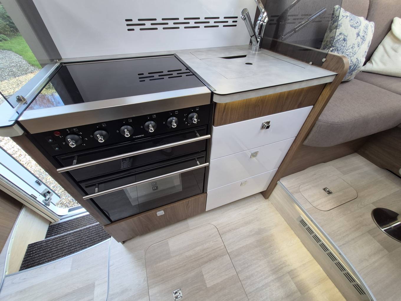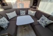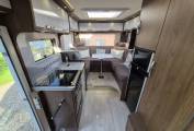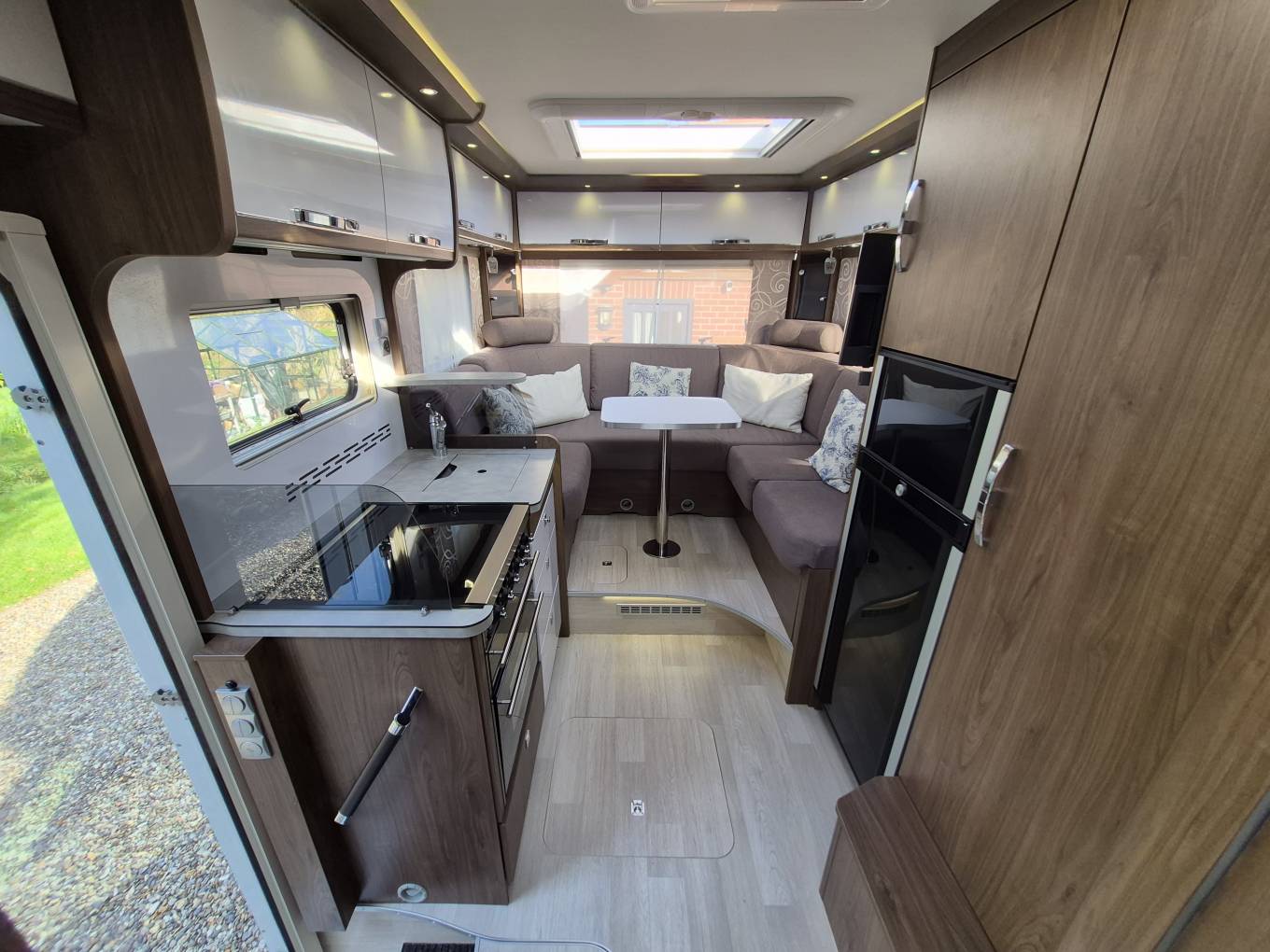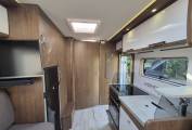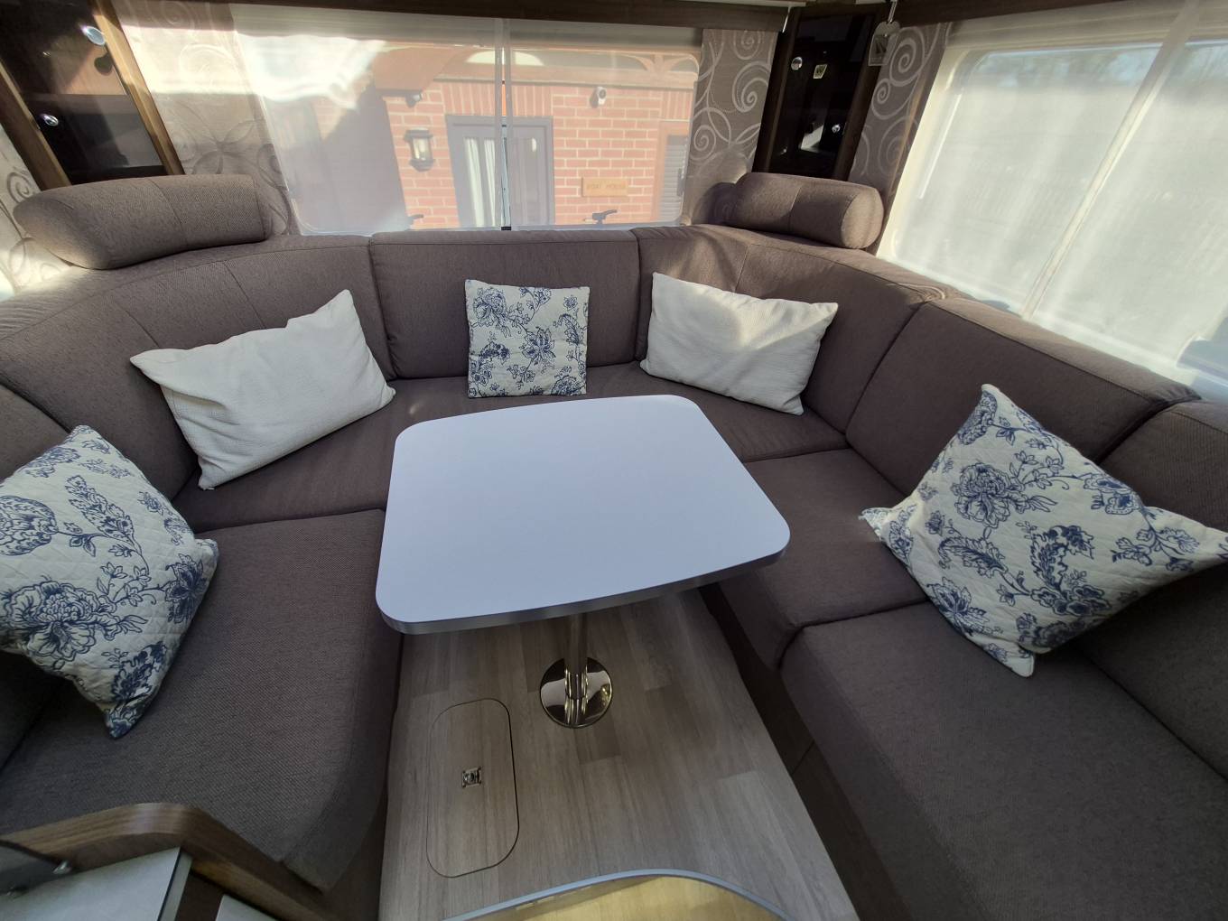 Inside you can enjoy the comfort of a welcoming rear lounge with panoramic views in the U shape seating and removable table (possibility of making this area into a 3rd berth but would require a different table), TV with soundbar and plenty of overhead storage, and a concealed 3rd belted seat.