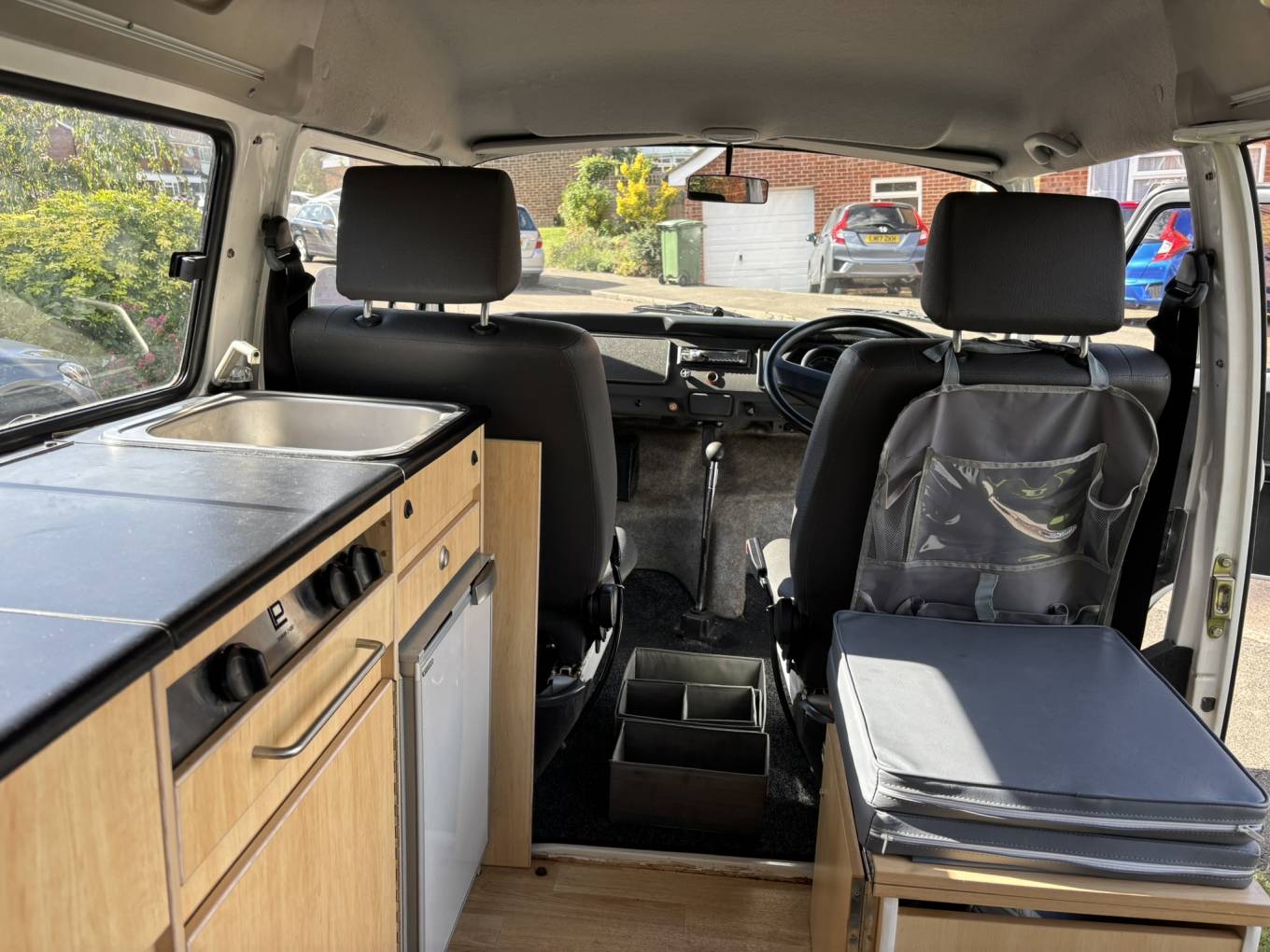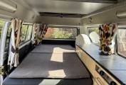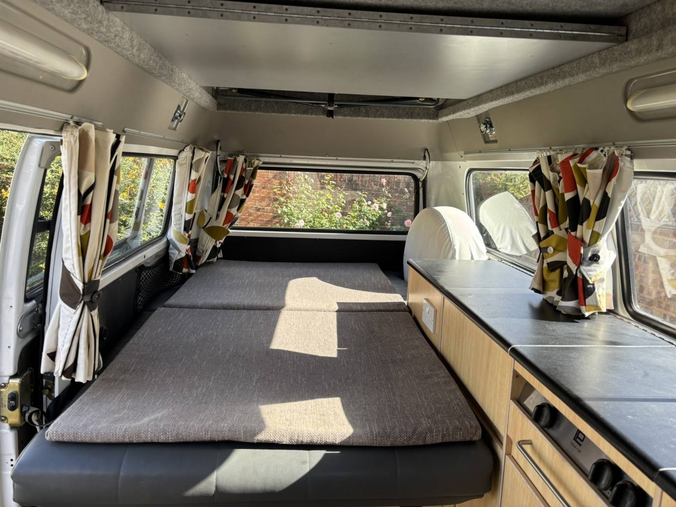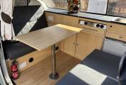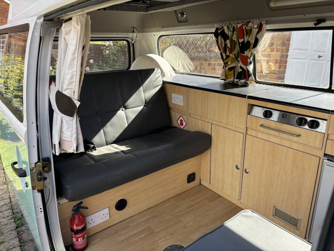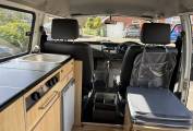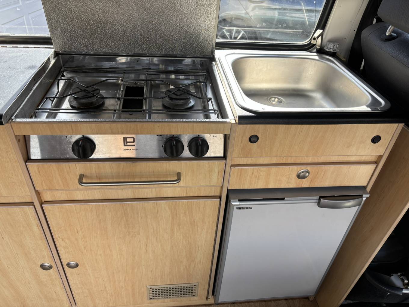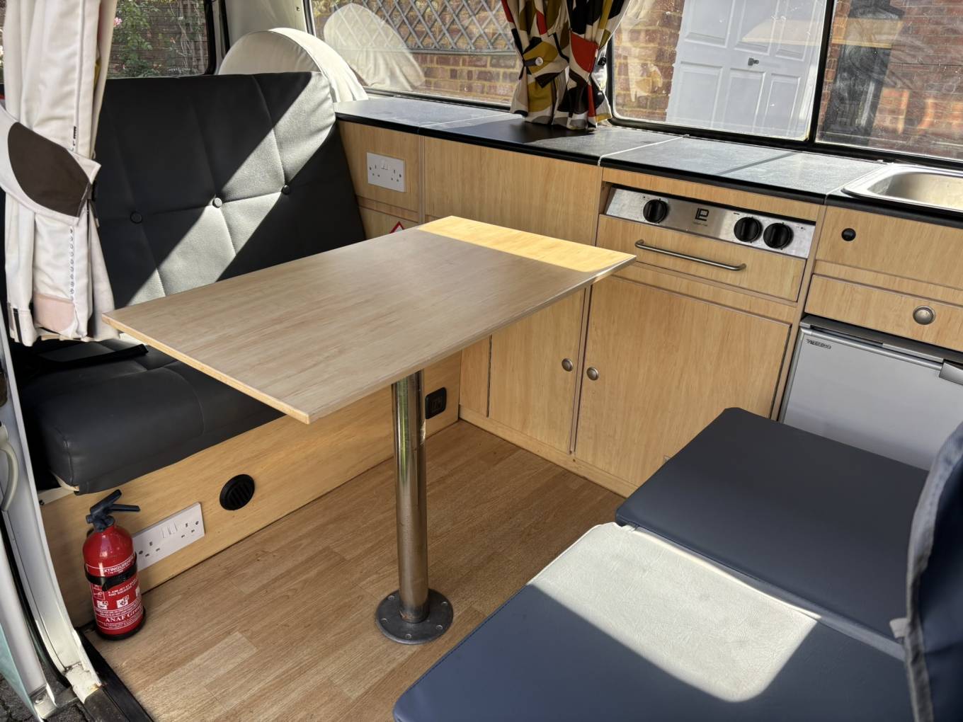 This campervan comes with (but not limited to): Pop top roof, Attachable dining table, RocknRoll bed, Pioneer radio system, Blinds, Heating, Storage cabinets, Fridge/freezer, 2 ring burner hob, sink/tap unit.