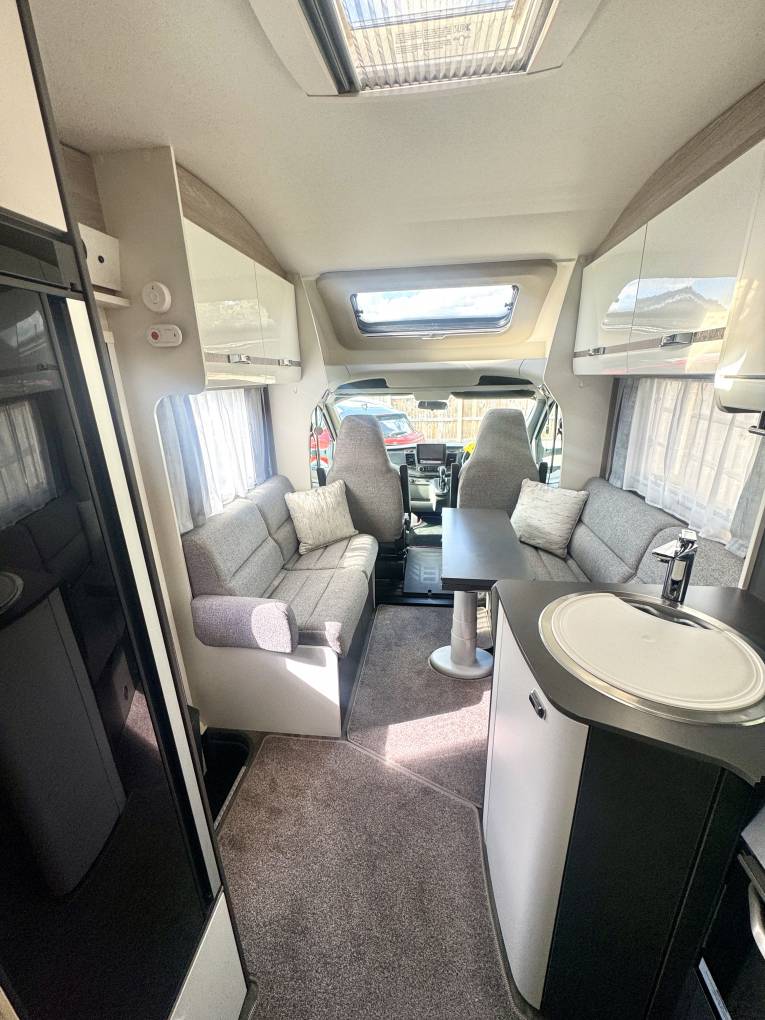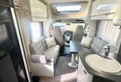 The kitchen is impressively equipped and features a Thetford oven and grill, a dual-fuel hob with an electric hotplate and 3 gas burners, extra worktop space with lift up worktop, a microwave and a 133 litre Dometic dual hinged fridge freezer with automatic selection.