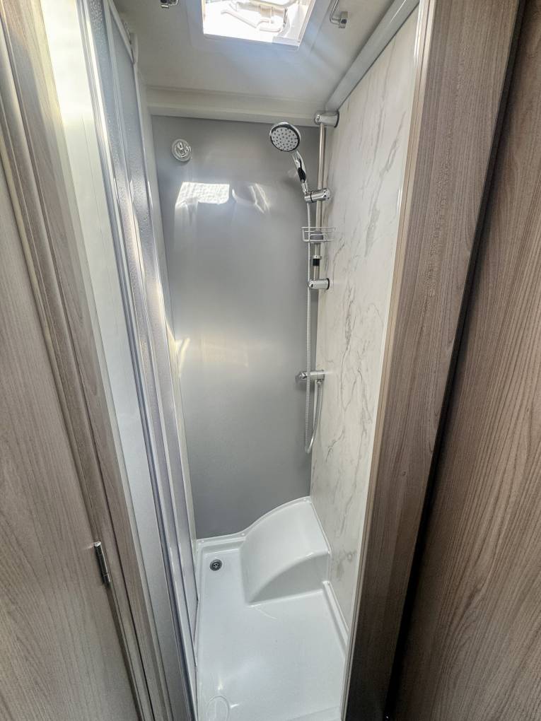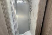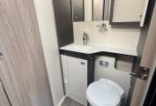 The bathroom features a superb Ecocamel Jetstorm power shower that uses less water. On the other side of the motorhome is a Thetford cassette toilet, a wash basin with a mixer tap, a large mirror and 2 bathroom storage cupboards. There are sliding doors between the bedroom and also the lounge so the bathroom can de divided off.