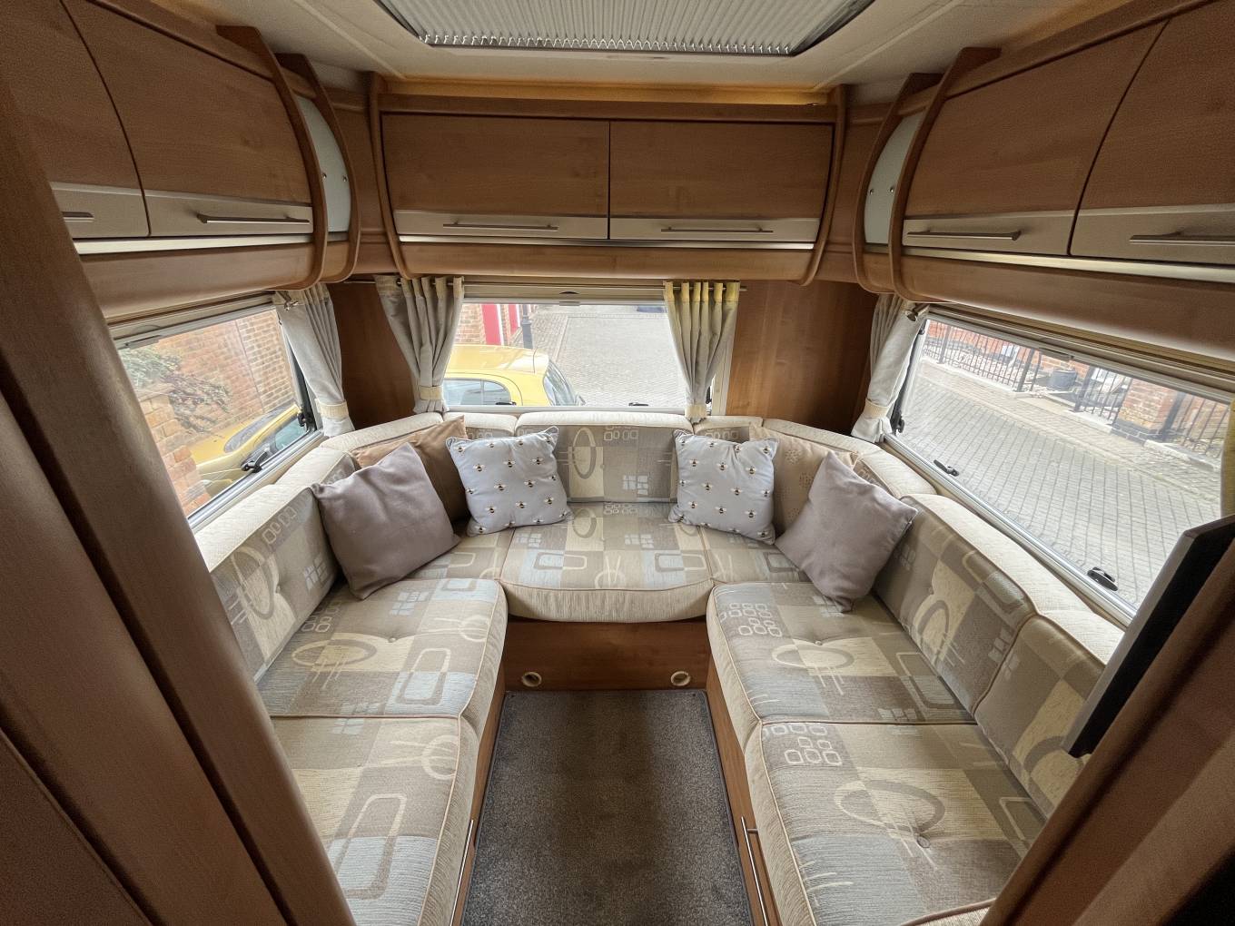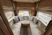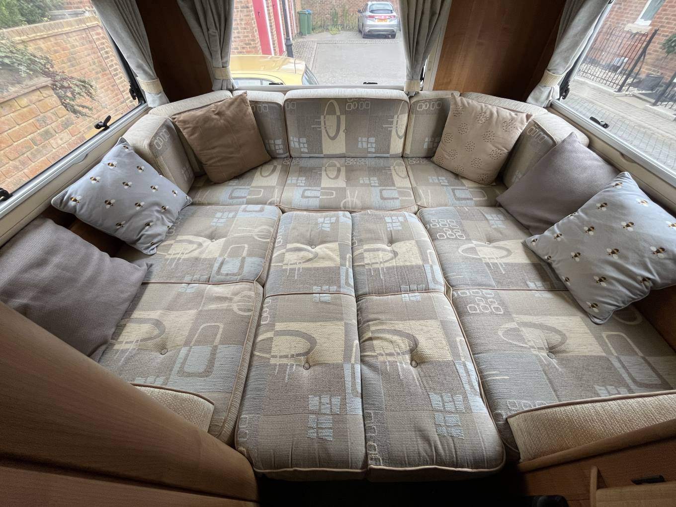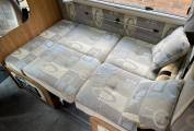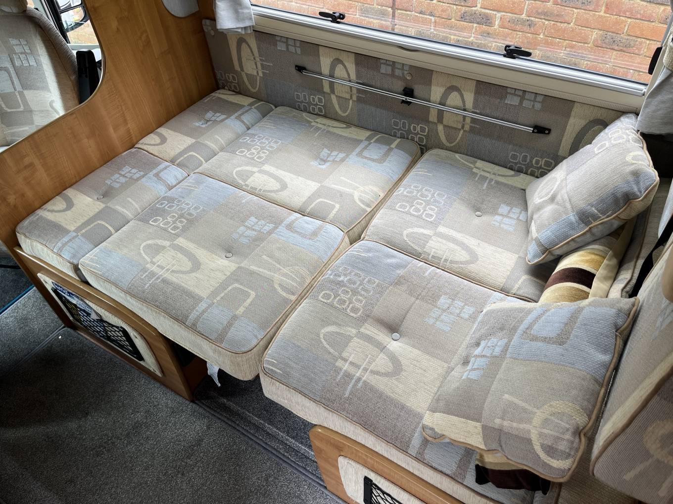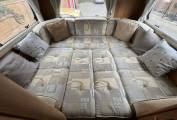 Its standout feature is the versatile six-berth layout. At the front, a spacious lounge with facing sofas and a central dinette can quickly convert into sleeping areas. Above the cab, there’s a full-sized double bed ideal for kids or guests. Towards the rear, a large U-shaped lounge provides a relaxing space for socialising, dining, or watching TV; it also converts into another generous double bed. This dual-lounge setup makes it highly flexible for families with different routines.