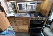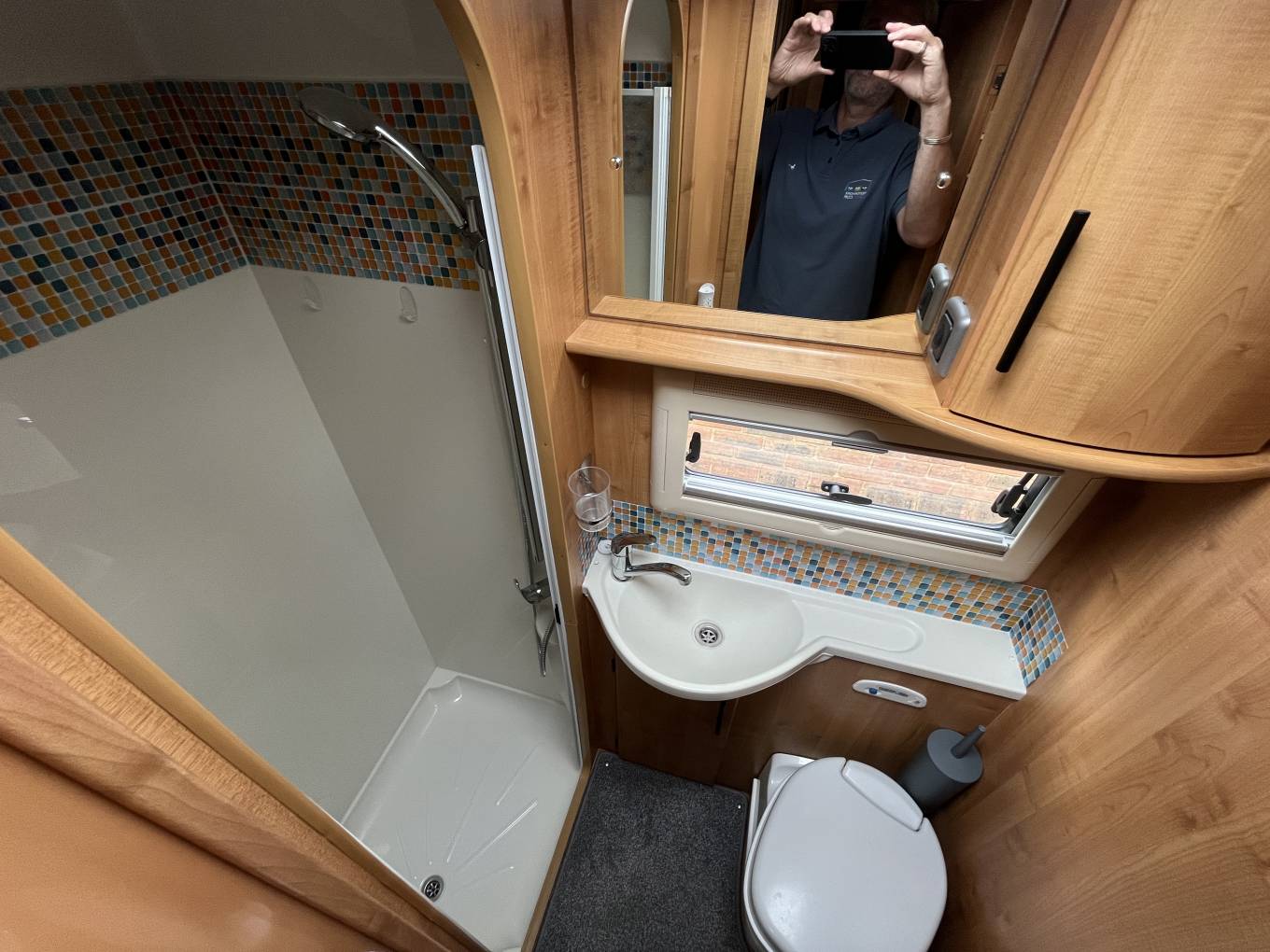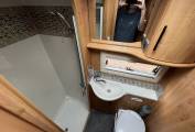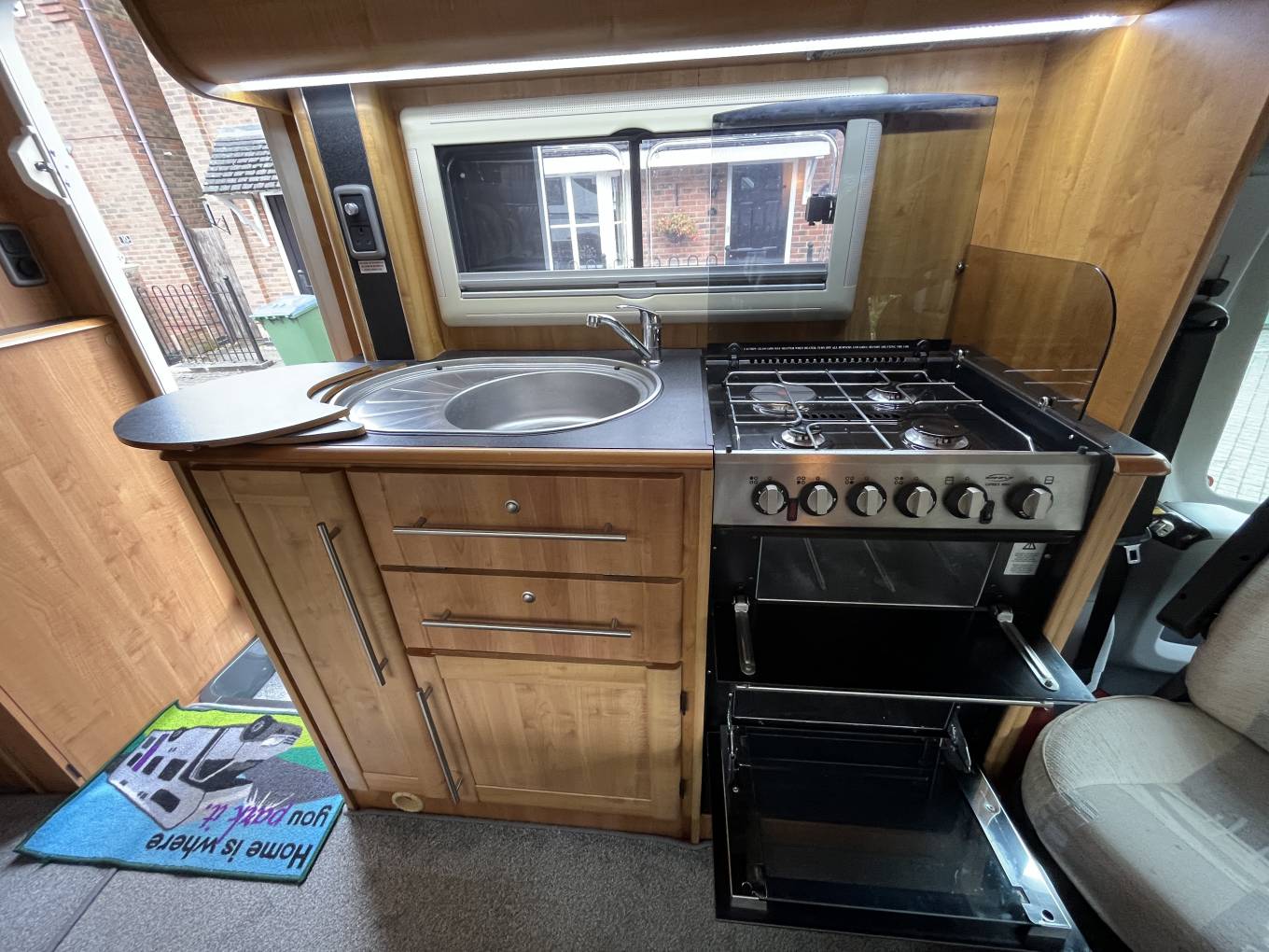 The well-equipped kitchen sits mid-vehicle, offering a full oven, grill, dual fuel hob, sink, and ample worktop, plus a large fridge/freezer, perfect for self-catering on the road. Opposite, the washroom includes a cassette toilet, hand basin, and shower, providing all essential facilities without compromise.