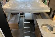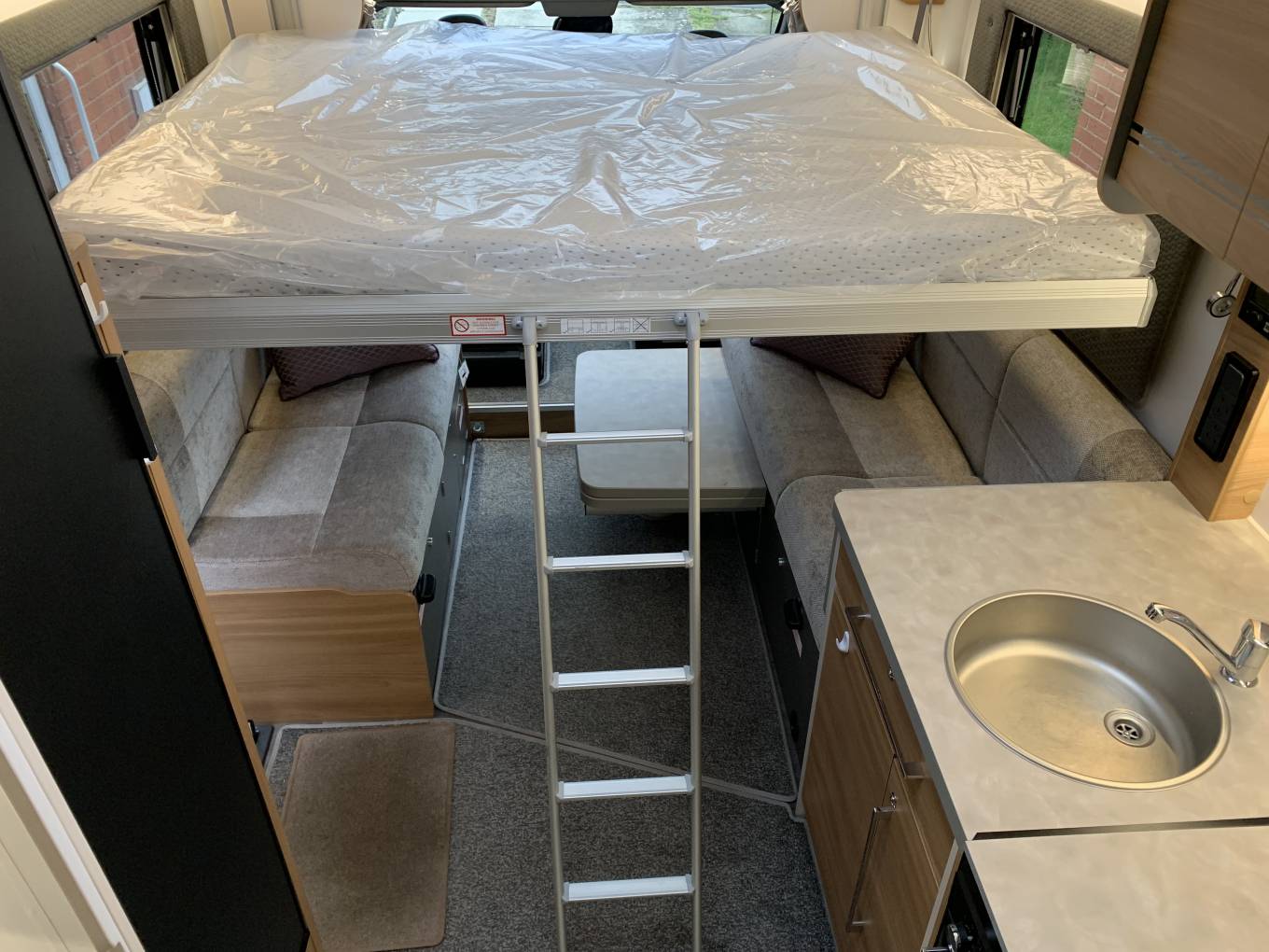 Above is the electric drop down bed, that can be used in multiple positions depending on who is in the motorhome, including at the level of the sofas.