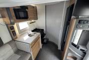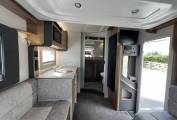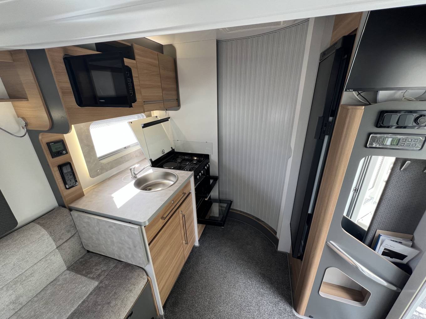 In the kitchen, there is a cooker with oven, grill and 3 gas burners and it has worktop over it, then sink, with plenty of storage surrounding. Opposite is a large fridge freezer, a TV bracket is mounted next to the habitation door.