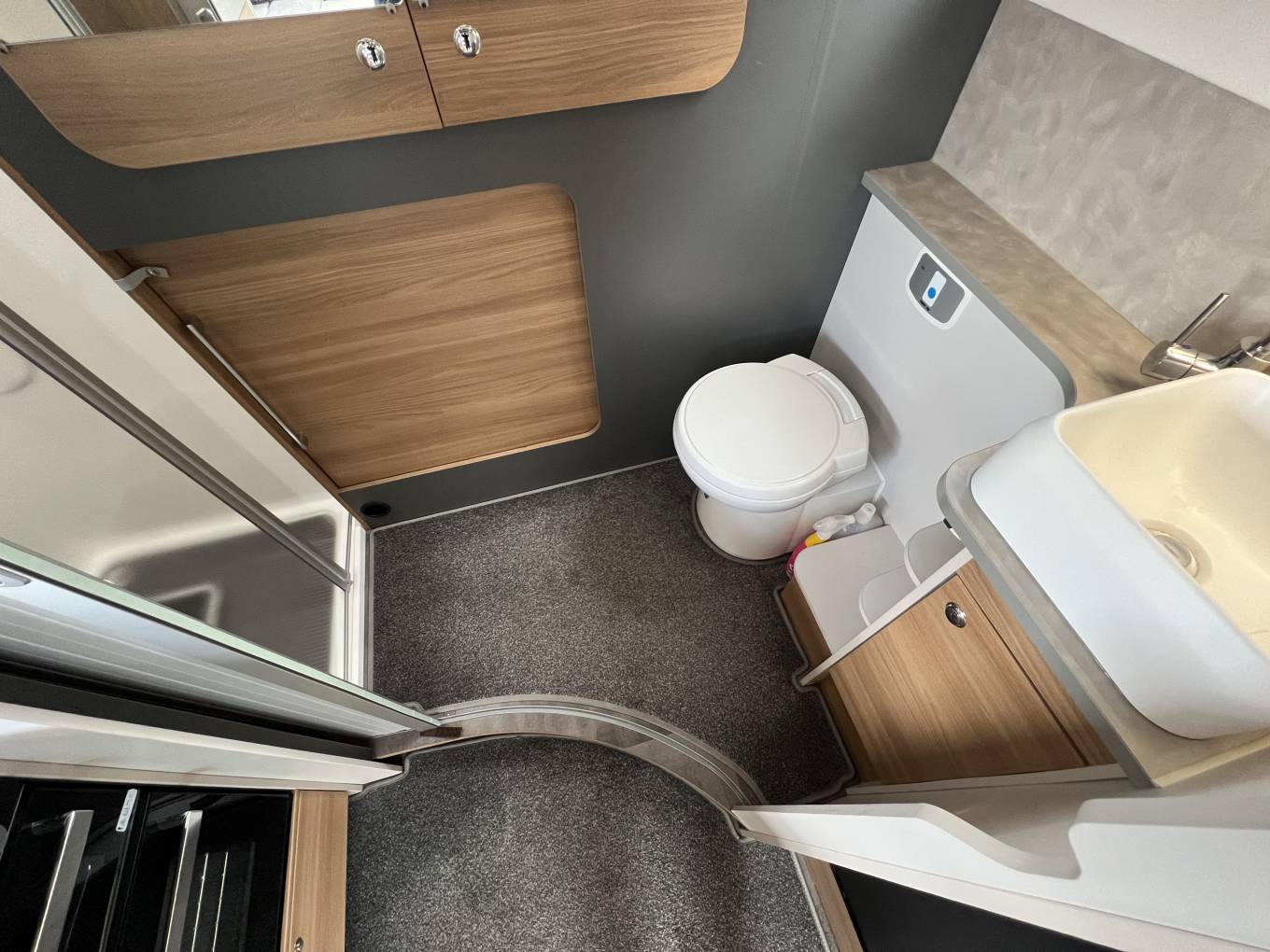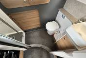 The washroom includes sink, cassette toilet, then separate shower cubicle. There is also an extensive cupboard with shelving, again using the full width of the motorhome. A sliding door allows access to the garage
