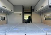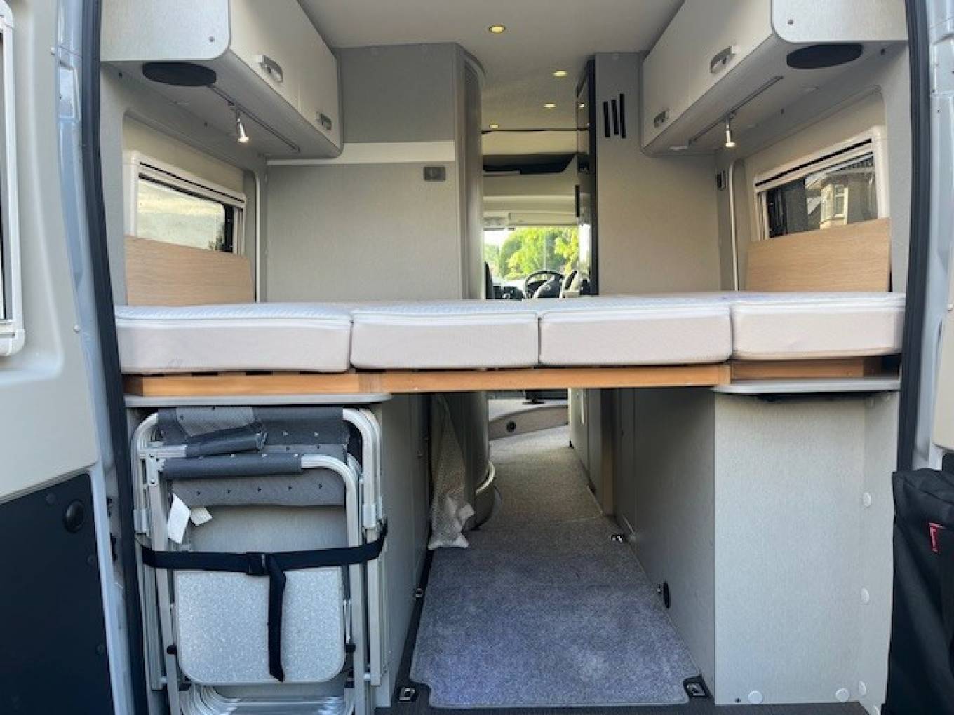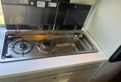 Sleeping is via the rear Transverse Double Bed which can be opened to create a Walk Through / Travelling Storage Space. The Pop Top provides an additional Comfortable Double accessed via a ladder