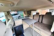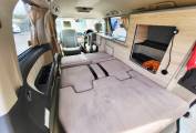 Rock and roll bed on floor rails can be adjusted to sit in different positions throughout the rear of the van. Gas hob and sink with under counter fridge are also provided.