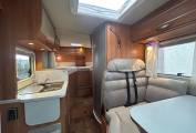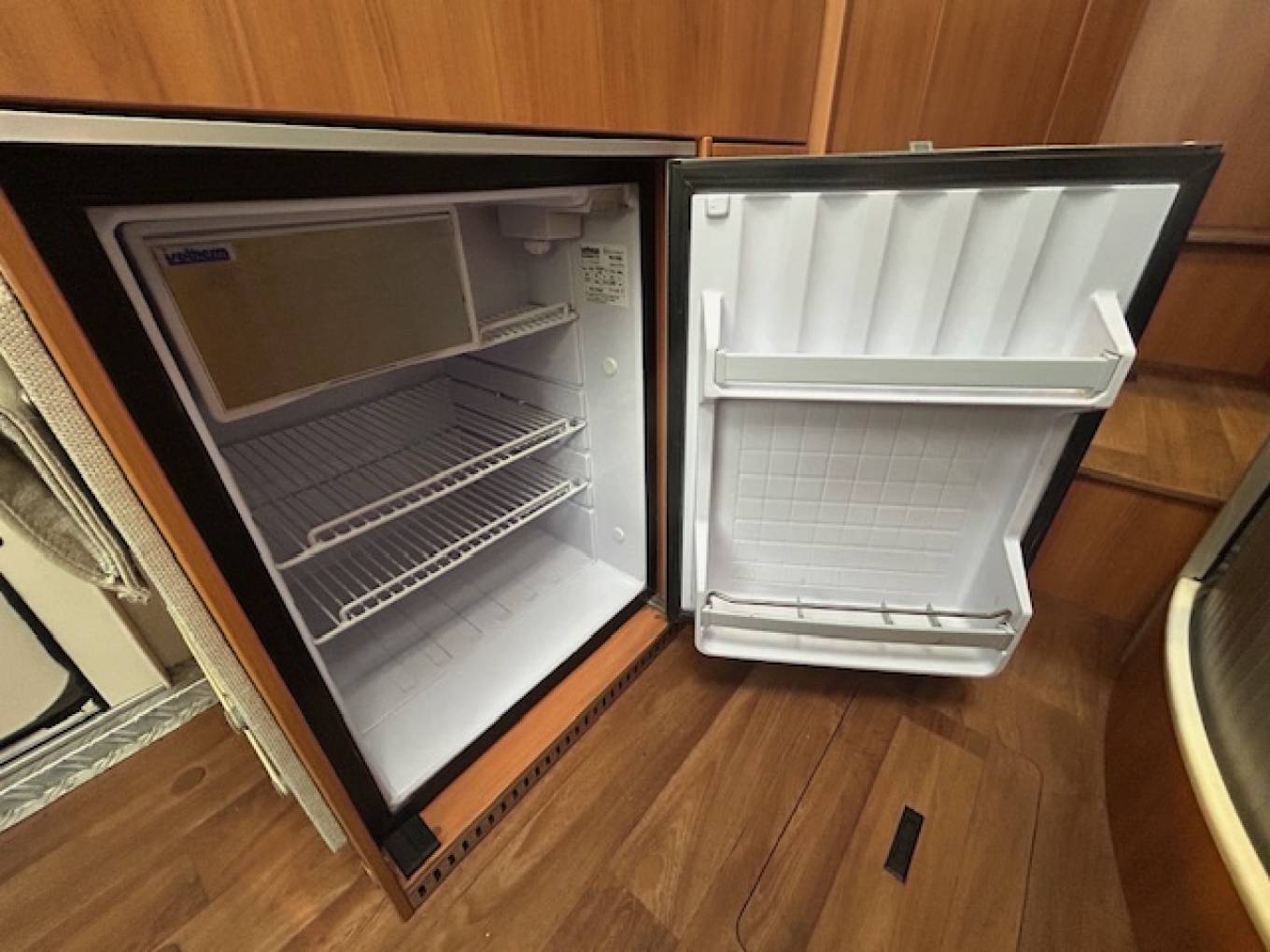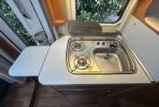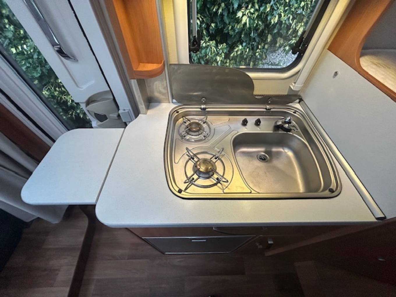 The kitchen is made up of a 2 burner gas hob, a Isotherm compressor fridge, sink and additional workspace provided by an elevating leaf.