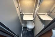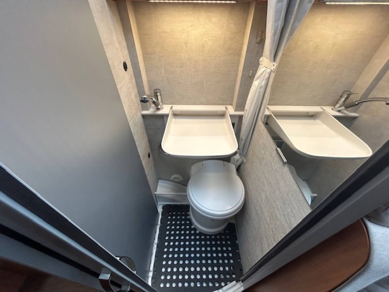 The central washroom has a sliding door, washbasin which folds away when showering, Thetford swivel cassette toilet and a mirror.