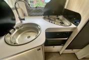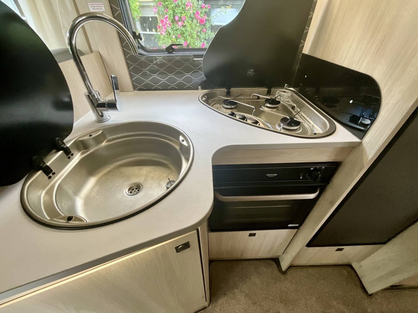 The kitchen is fully equipped with gas hobs, Thetford oven and grill, sink with hot and cold water, 240v socket, large fridge/freezer, and plenty of storage space throughout.