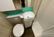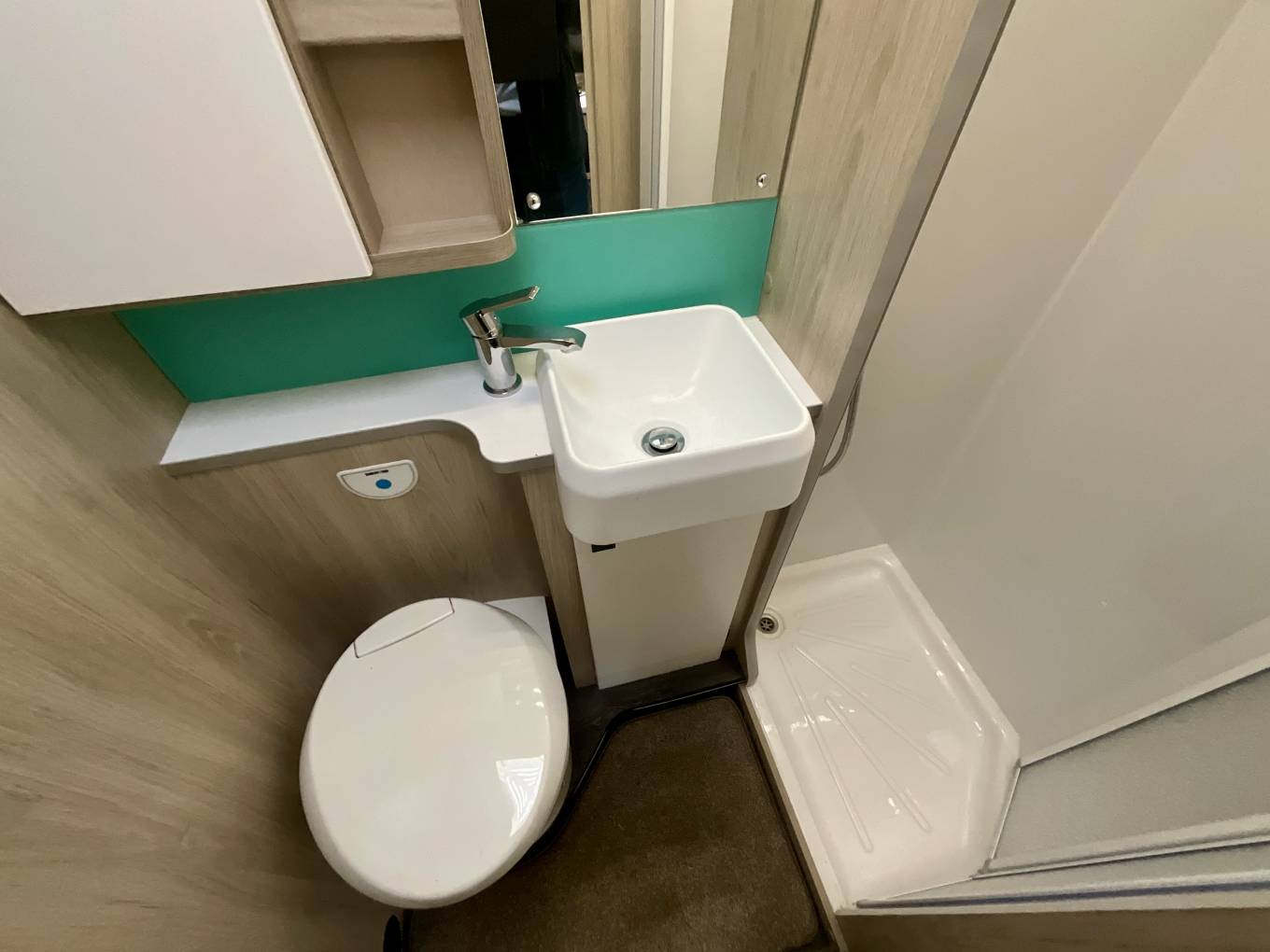 Opposite, the washroom is spacious and comes with a shower cubicle, Thetford toilet with cassette, washbasin with hot and cold water and large vanity unit.