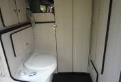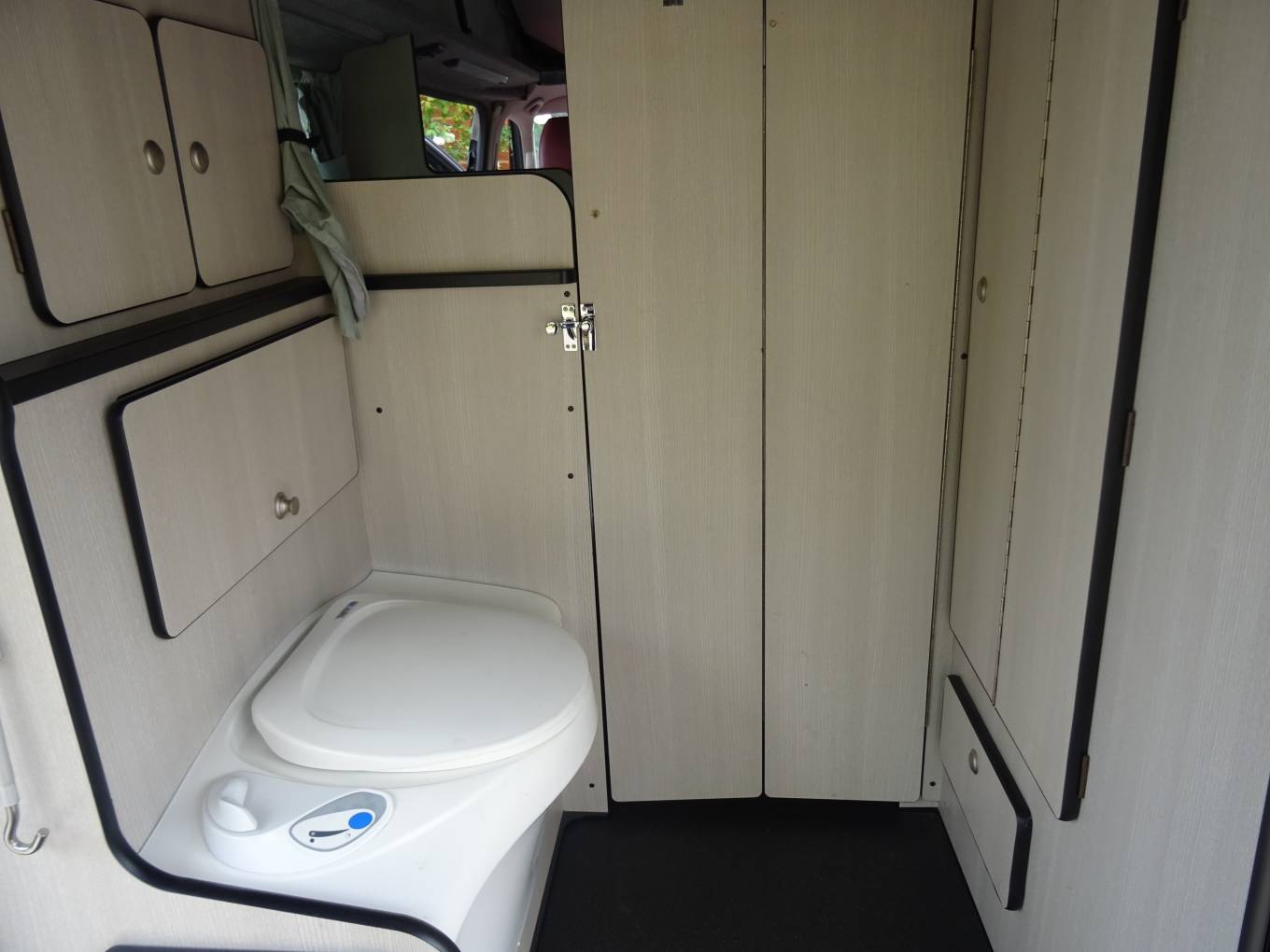 The LWB allows enough space for the rear toilet section which has a fold out privacy door. The bench toilet is electric flush, there is more storage including a small hanging wardrobe and a pull out wash basin with tap.