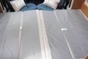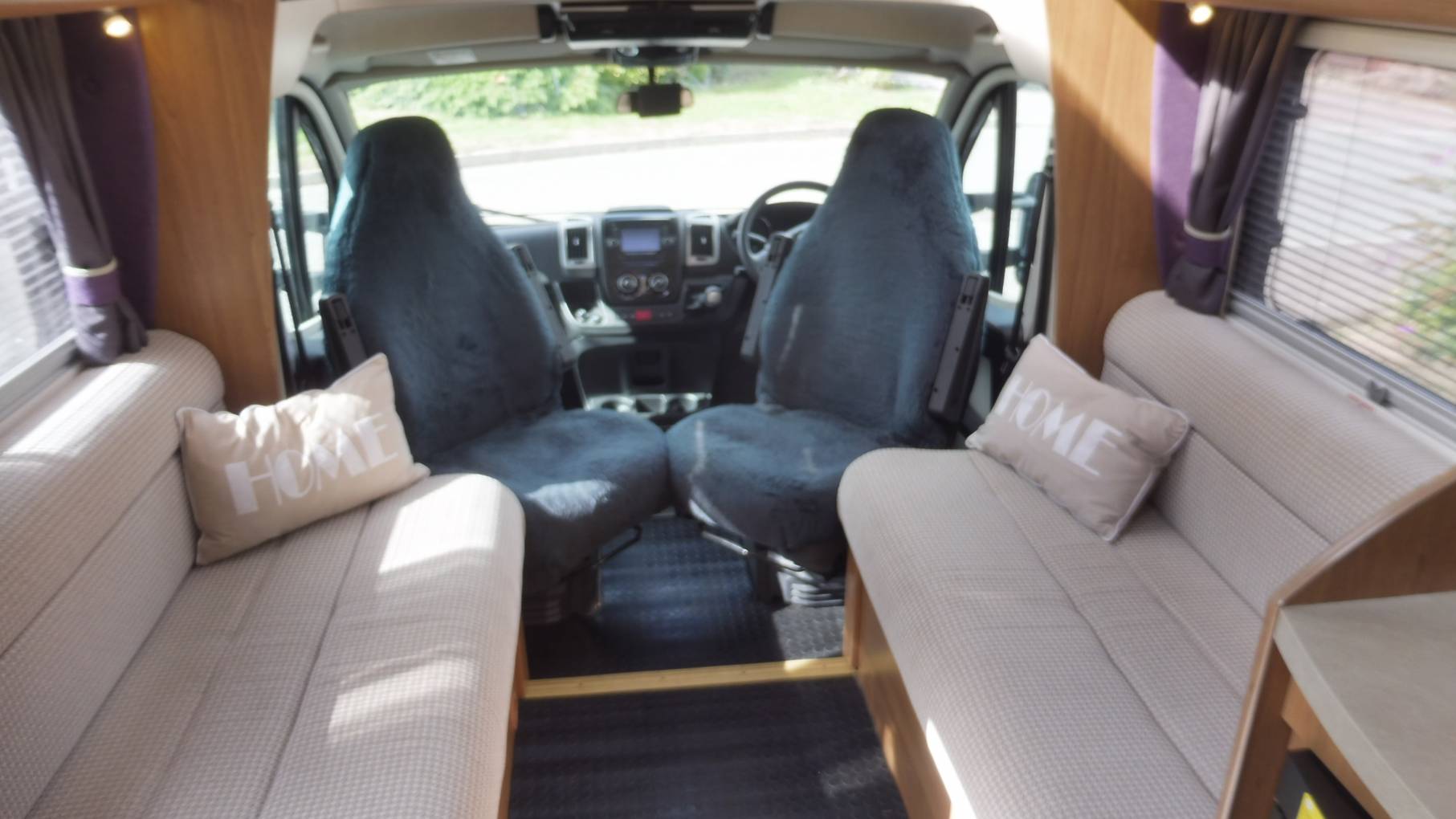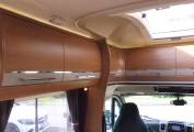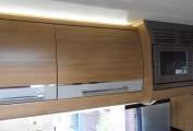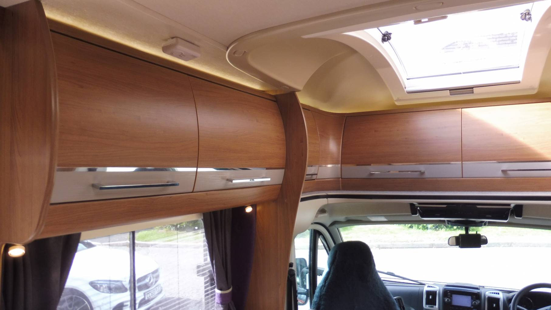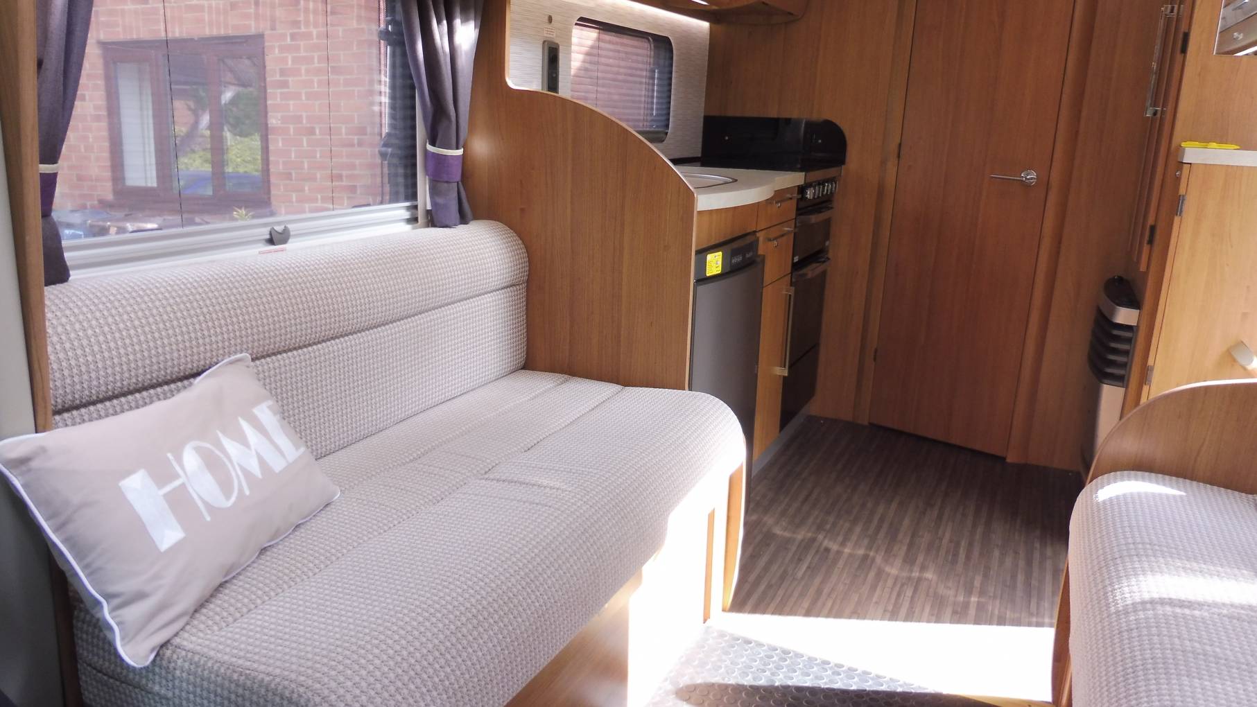 One of the beauties of the Autotrail range is the interior feeling of space, partly due to the front swivel seats but equally due to the use of contemporary fabrics that offer that luxury feel as well as the large windows and rooflights that flood the motorhome with natural light. As we come to the centre lounge, there is a single sofa down each side that slide out to make the large double bed. There is also plenty of storage space in the overhead cabinets and a large hanging cupboard. An Avtex television, with DVD, drops down between the driving seats for your entertainment on those rainy days.