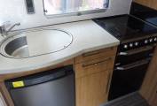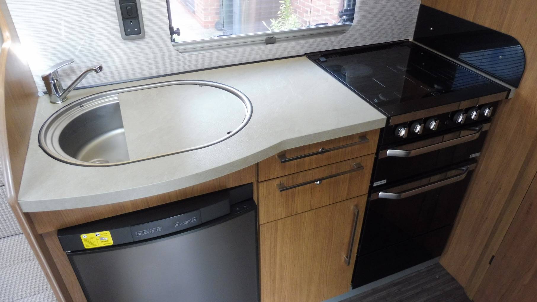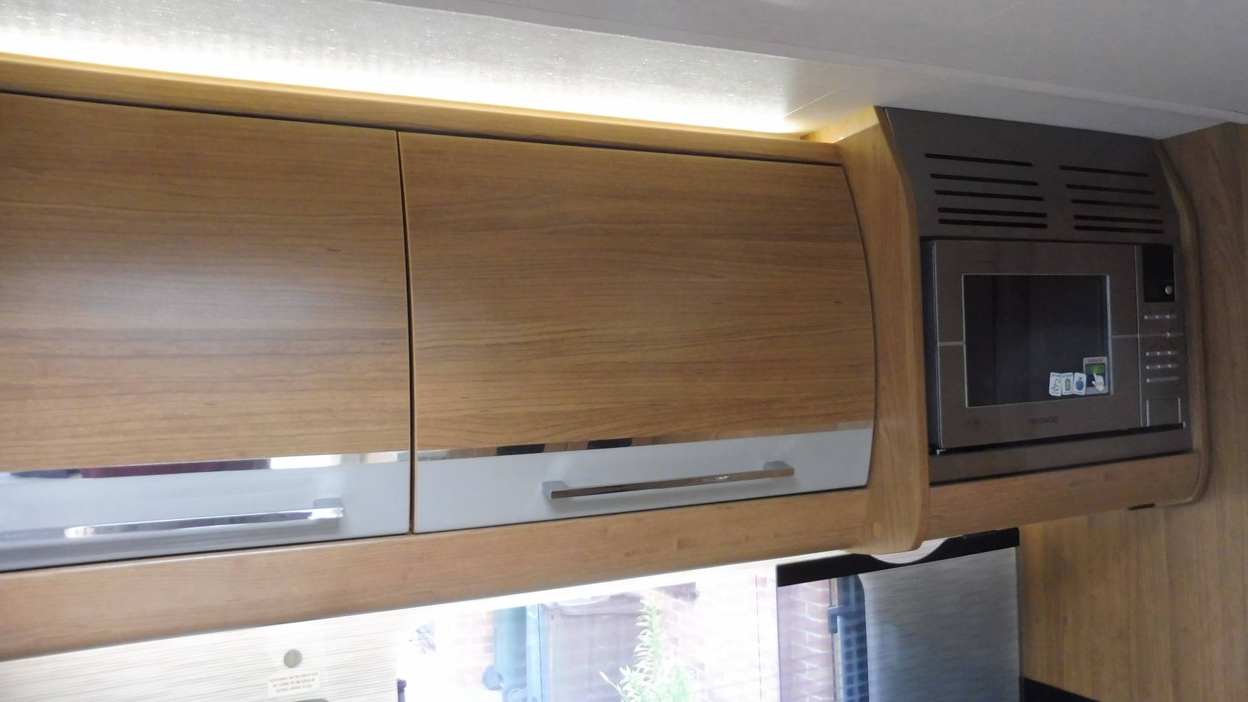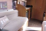 Carrying through to the centre of the motorhome, we have the kitchen area where there is a large oven with grill, 3 ring gas and 1 electric hob, sink with mixer tap and a Dometic fridge with freezer compartment, microwave and a very large work top area, perfect for preparing and plating up a nice meal.