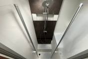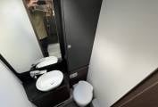 The midship kitchen is fully equipped with a large fridge/freezer, three-burner hob, oven, grill, deep sink, and ample storage, making it easy to prepare meals on the go. Opposite is the split washroom, with a separate shower cubicle and a contemporary vanity area, designed for practicality without compromising comfort.