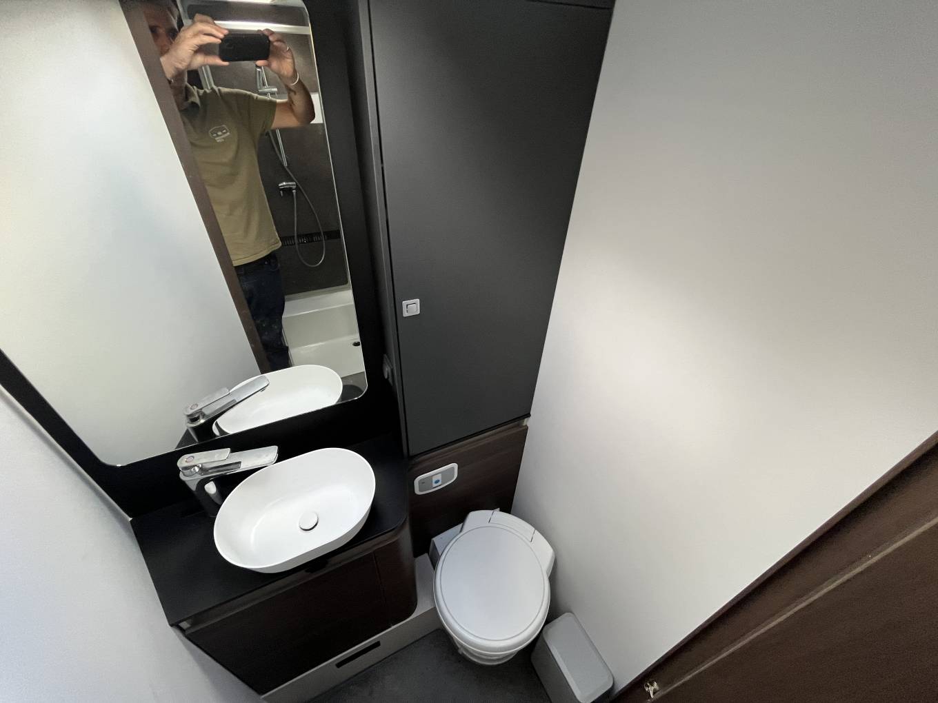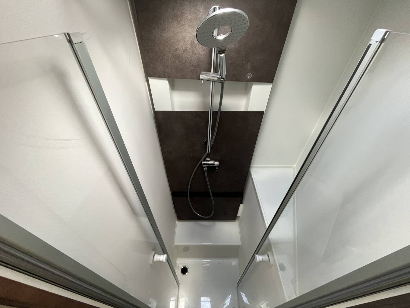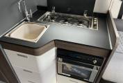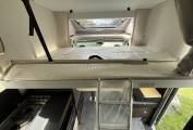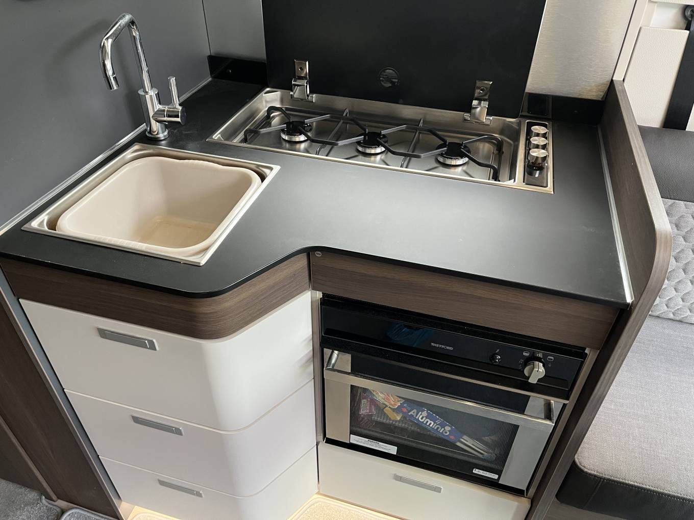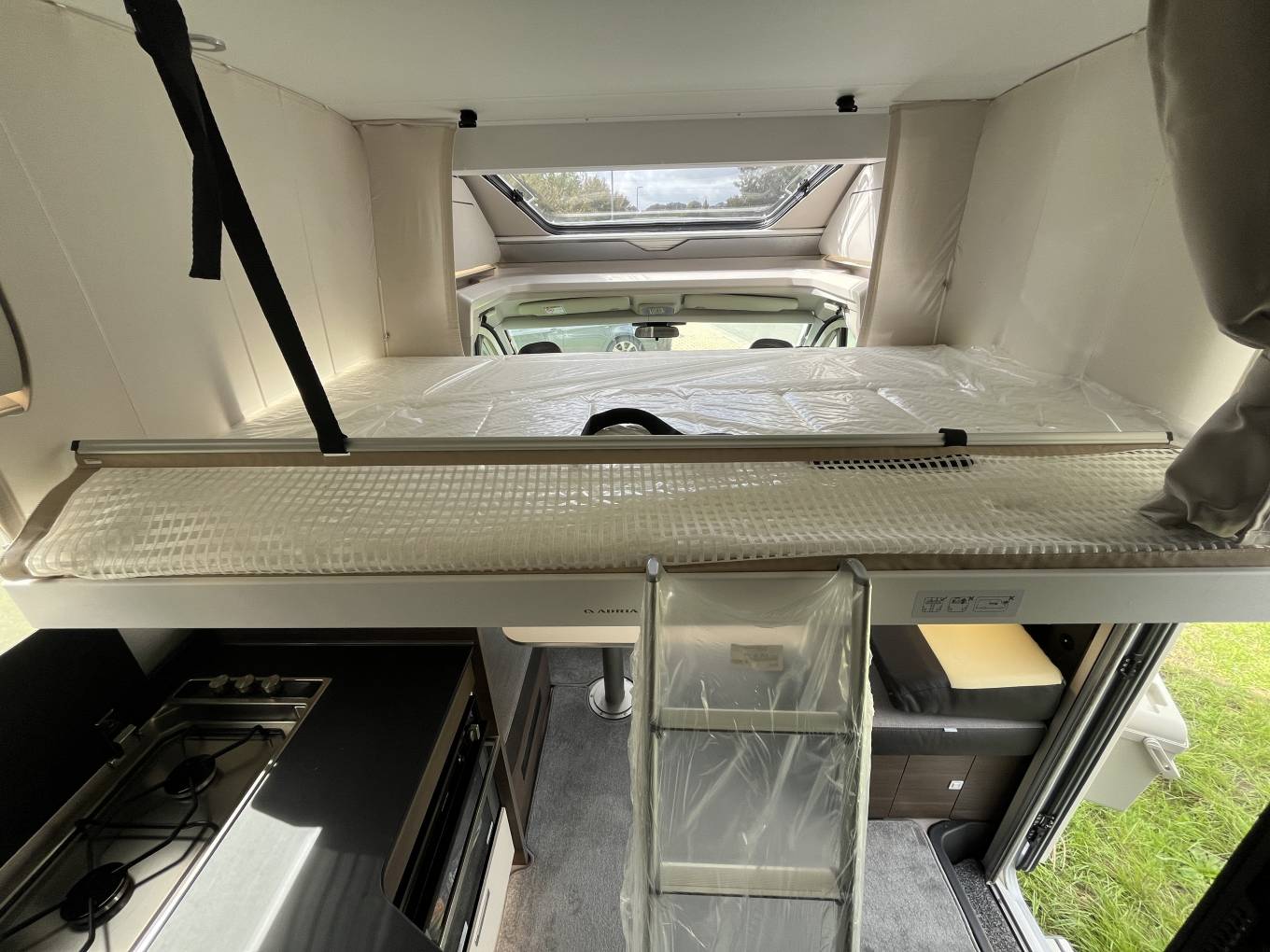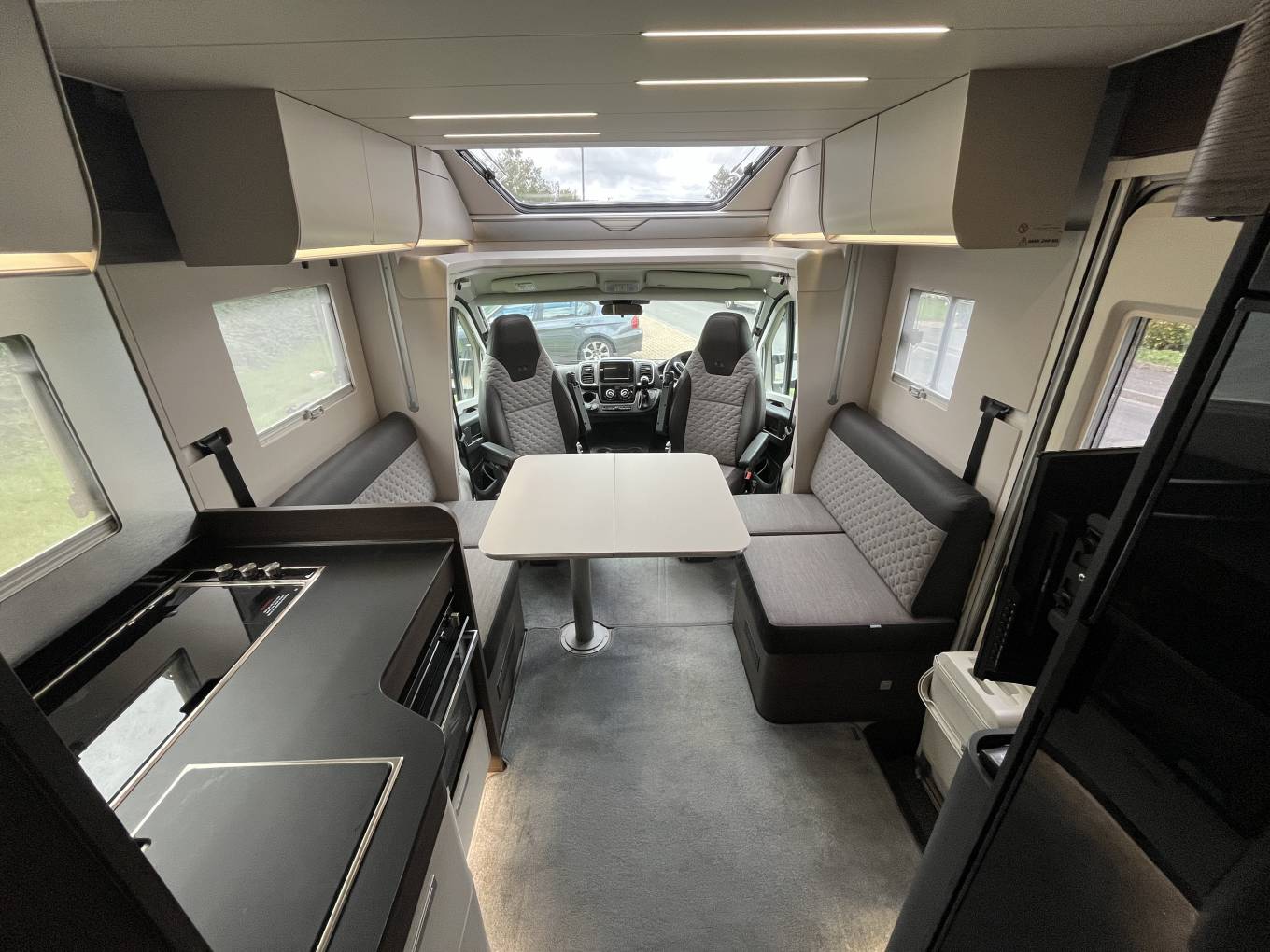 At just under 7.5 meters long, it offers a spacious yet manageable layout. The “DC” floorplan is highly popular, featuring a large front lounge with facing sofas (easily convert into 2 forward facing seats with seatbelts), swivel cab seats, and an electrically operated drop-down bed that integrates seamlessly into the ceiling when not in use. The panoramic front window and skylights flood the living space with natural light, enhancing the open, airy feel.