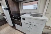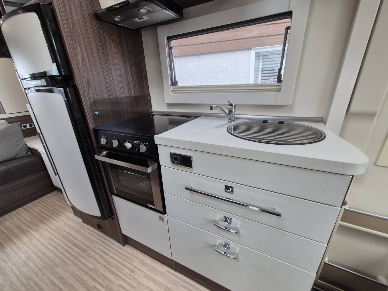 A modern side galley kitchen comprises two gas burners and one electric hotplate hob, Thetford Triplex combination oven and grill, extractor hood, circular stainless steel sink with mixer tap, slimline tower fridge and separate freezer box above. Plenty of storage and cupboard space throughout and a two-way ceiling skylight fan.