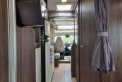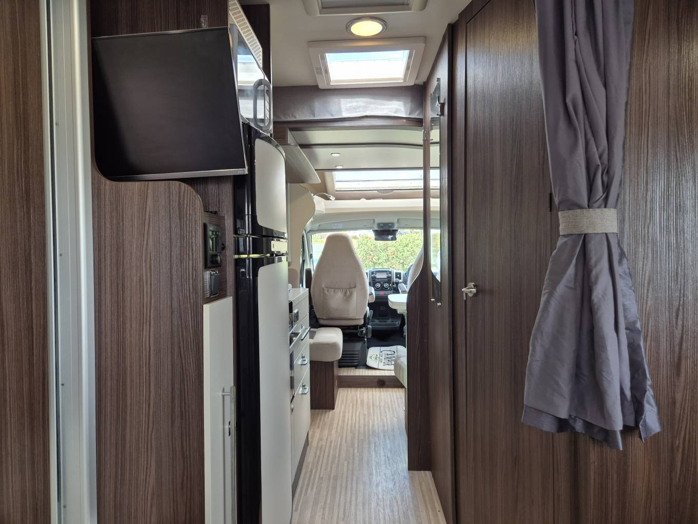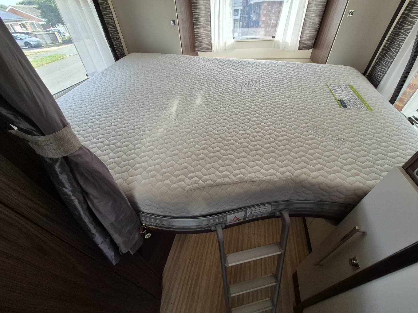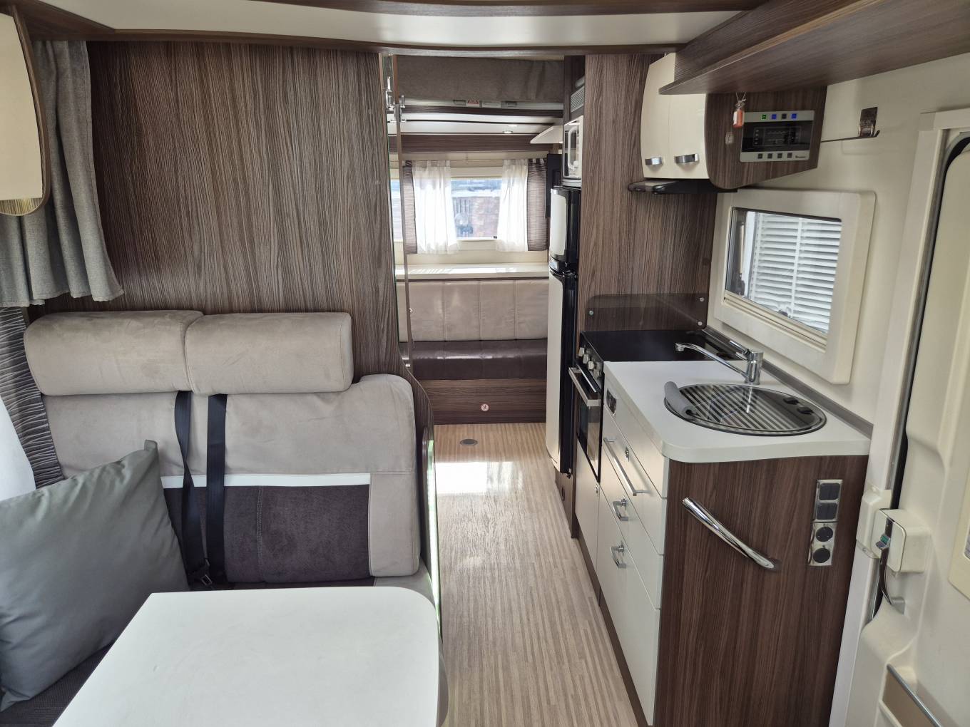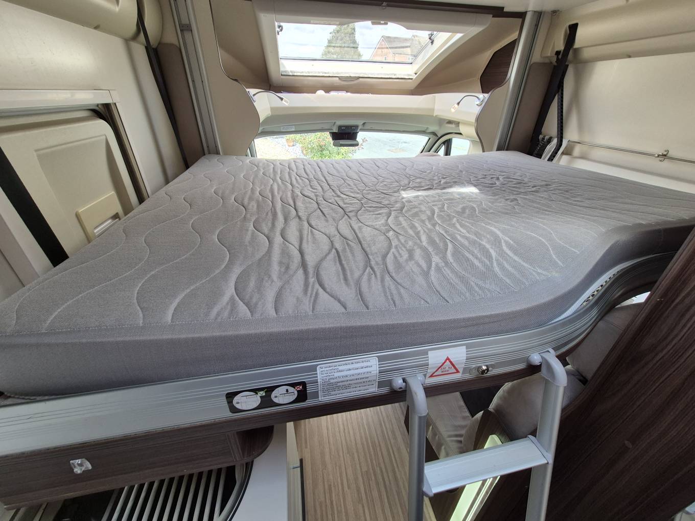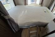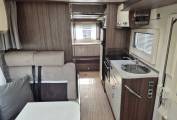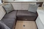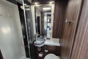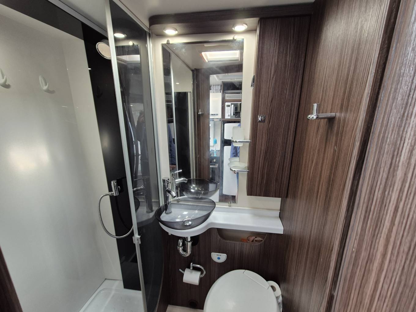 There is comfortable sleeping for up to four adults with the two electric drop-down double beds. The contemporary washroom area comes with a Thetford cassette toilet, vanity washbasin, mirror, skylight, medicine cabinet and walk-in shower cubicle with bi-fold door.
