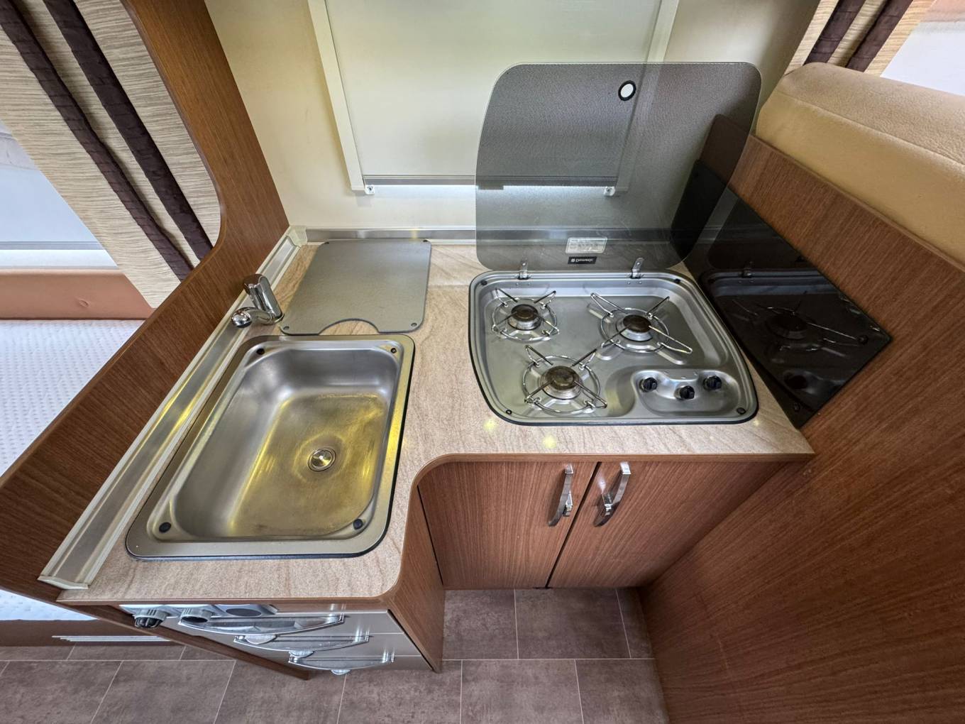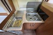 Step inside and you’re welcomed by a bright and thoughtfully designed interior. The well-equipped kitchen features a sink, generous worktop space, an oven/hob combo, and a tall Dometic fridge/freezer – ideal for preparing meals on the go. The Truma heating system ensures all-season comfort, whether you're chasing summer sun or exploring crisp autumn landscapes.
