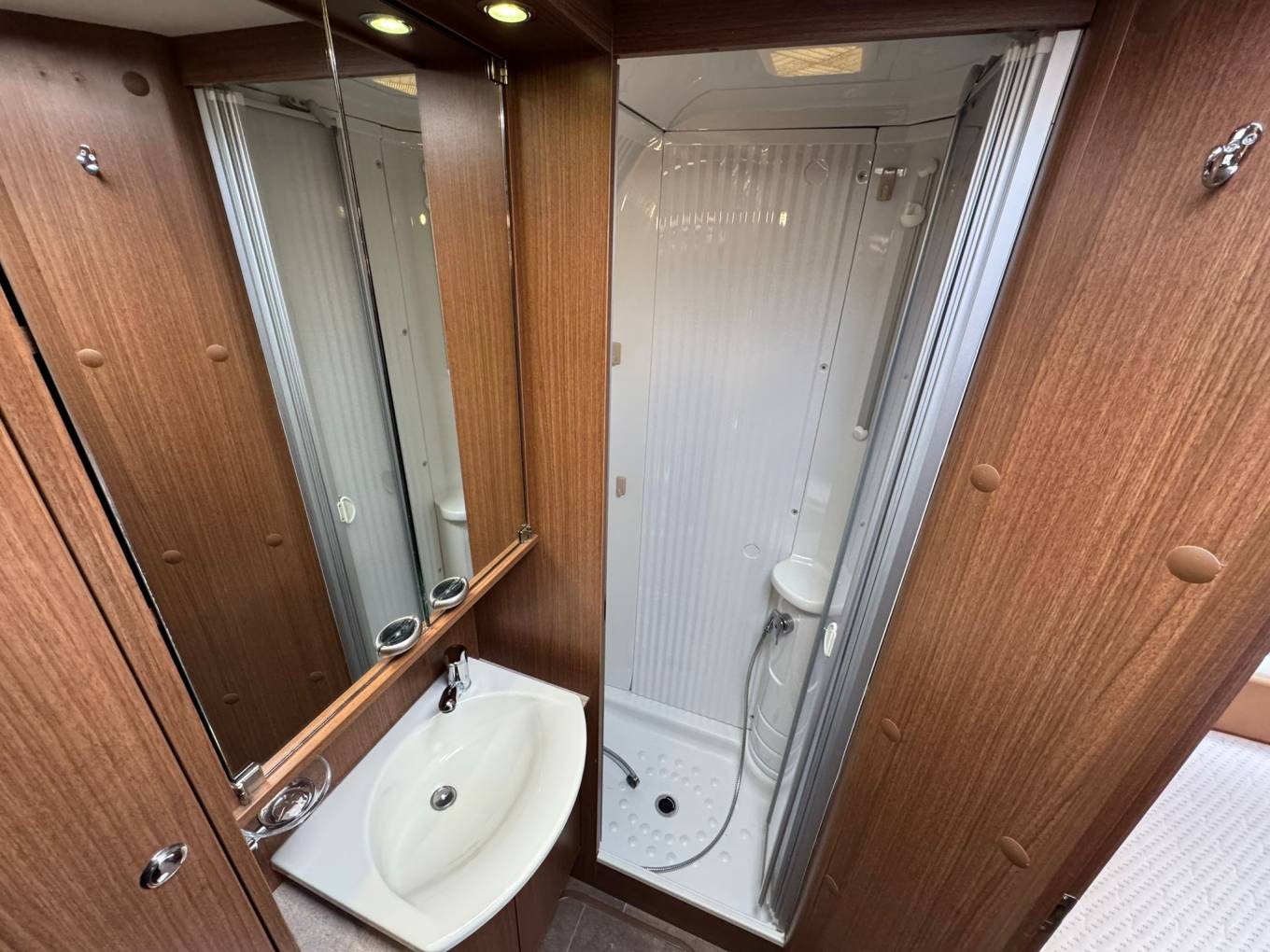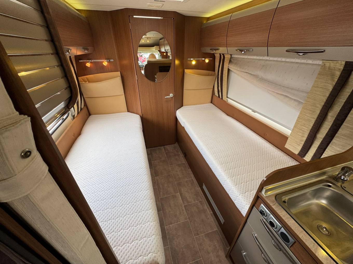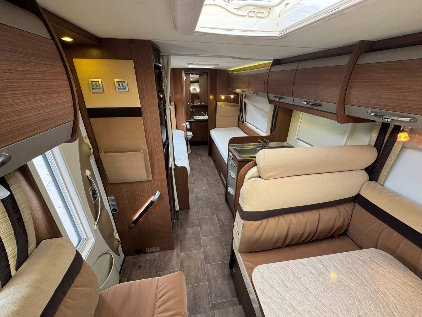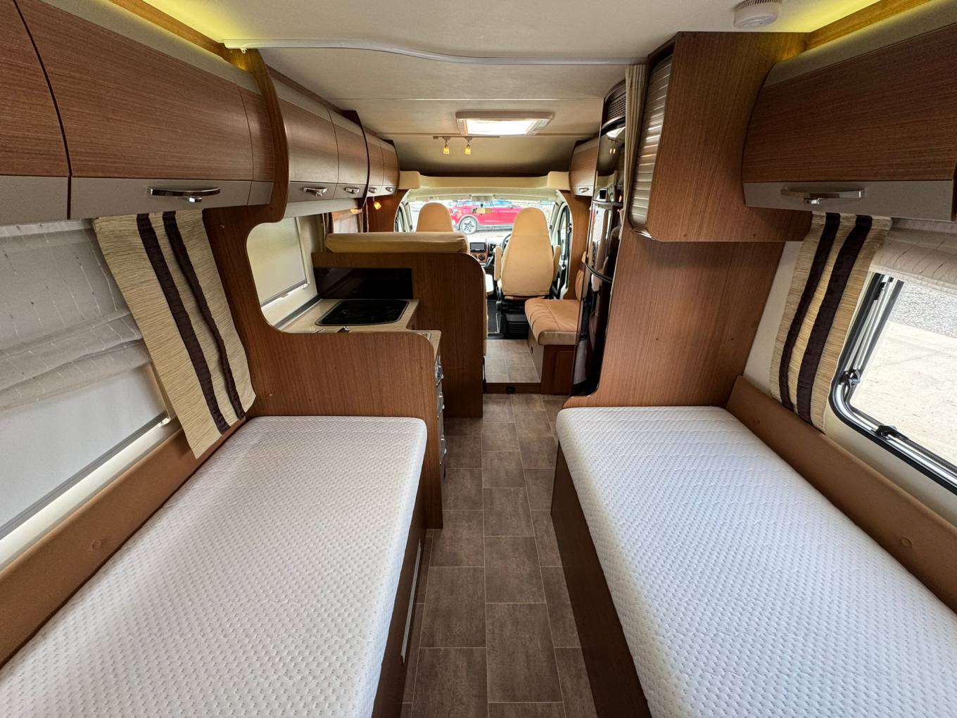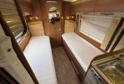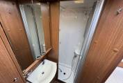 At the rear, you’ll find the standout feature of this model – the twin single bed layout, perfect for a flexible sleeping arrangement. There’s also a spacious washroom, adding to the overall practicality of this fantastic motorhome.