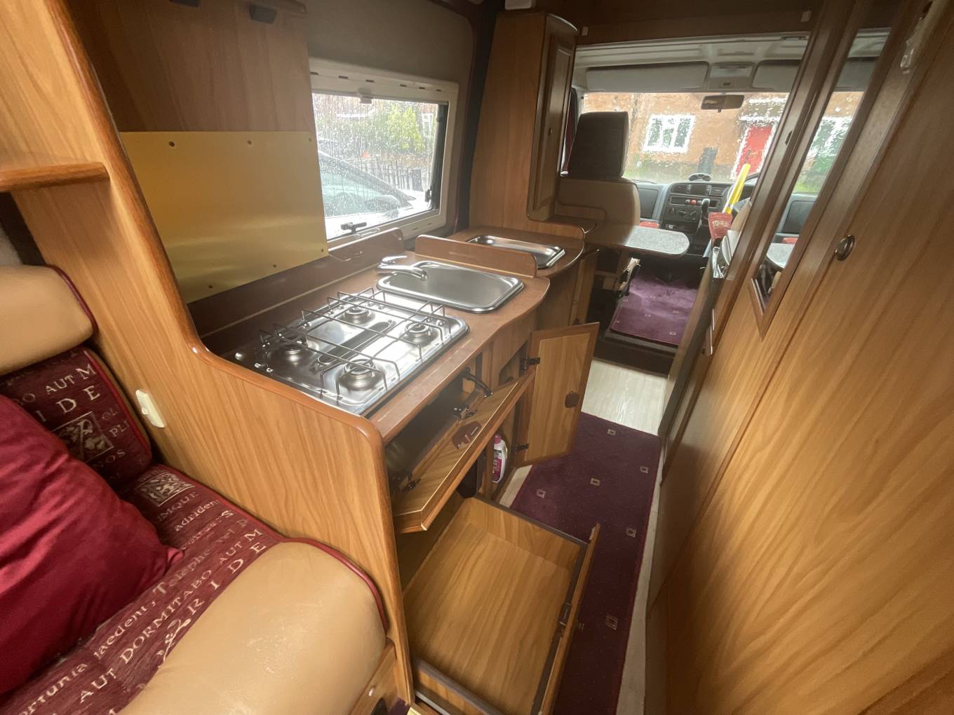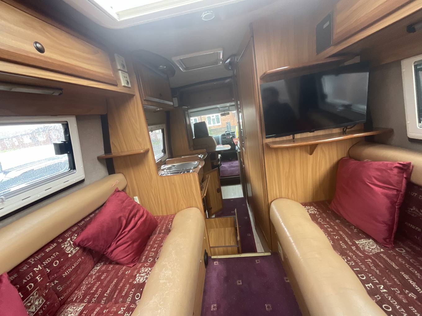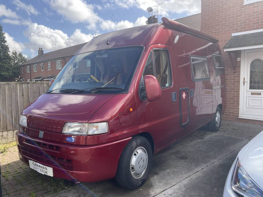 Motorhome depot Newport present this 2002 IH Savannah Irmao. A 2 berth motorhome with 2 seat belts. Based on the Fiat Ducato 14 TDi LWB High Roof with a 2800 cc diesel engine and manual 5 speed gearbox. Although this motorhome is only 5600 meterd long and 2020 meters wide it certainly packs a lot in. At the rear we have two side facing sofas that form the transverse double bed which is 6ft 3ins x 4ft. The dining tables sit between when required. The kitchen is on the near side of the van by the sliding door and features a 4 ring gas hob and sink with mixer tap. There are cupboards and drawers below with yet more storage above. There is a fold up worktop with side extention if you just need a worktop. On the other side of the van we have a wardrobe with SMEV oven & grill and fridge underneath. The washroom is a good size with a tip up sink and Electric flush cassette toilet. There is a 60 freshwater tank and also a waste tank. Gas is from an LPG system not bottles.A solar panel is fitted along with TV aerial. The underfloor storage is usefull but has a raised floor in the lounge.