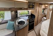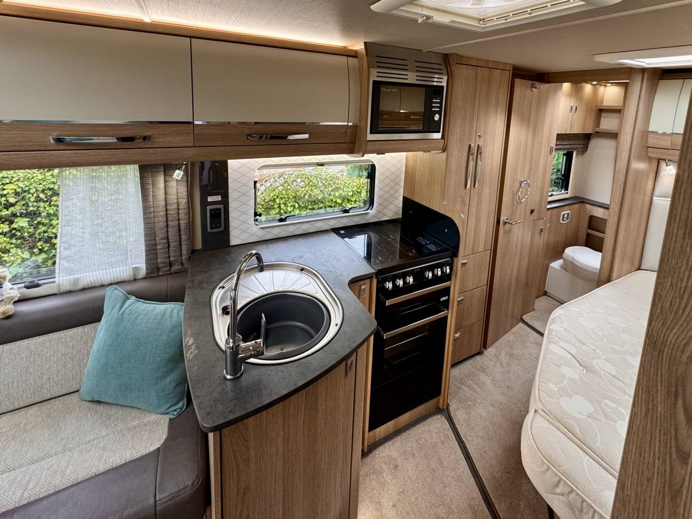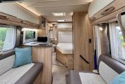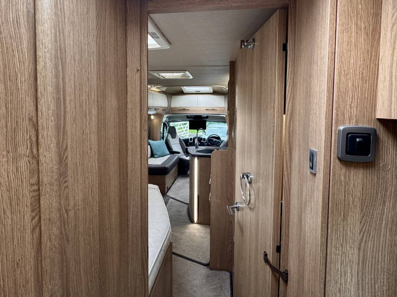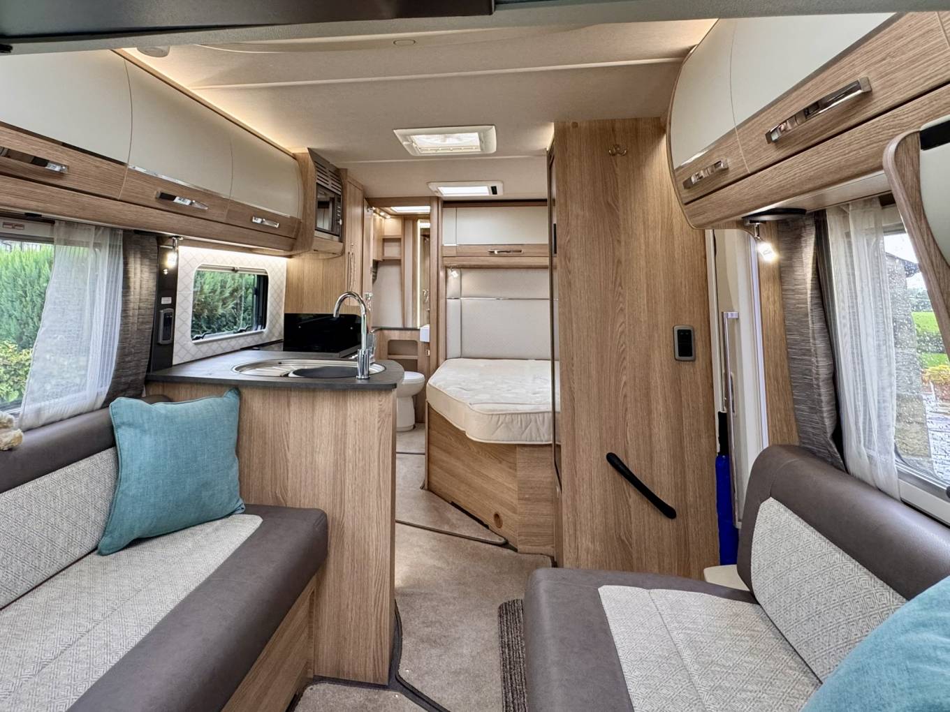 Low-mileage on the Fiat 2.3 automatic (140bhp). One previous owner, just 10,300 miles with full service history. The much-loved French double bed layout pairs with a modern yet classic interior designed for couples seeking a touch of luxury. The EB model delivers a spacious, comfortable living space with quality throughout
