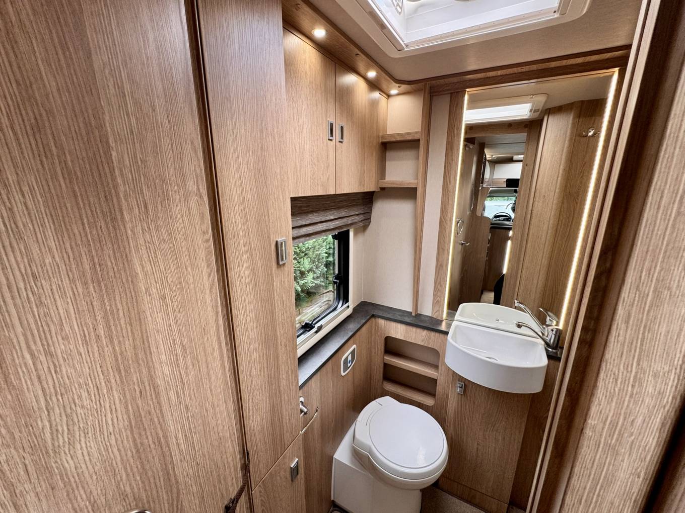 The spacious washroom offers a large separate shower cubicle, Thetford cassette toilet, basin with mixer tap, generous storage and a big mirror. Whale heating and hot water keep you warm and supplied with constant hot water, while the solar panel helps keep your leisure battery topped up off-grid.