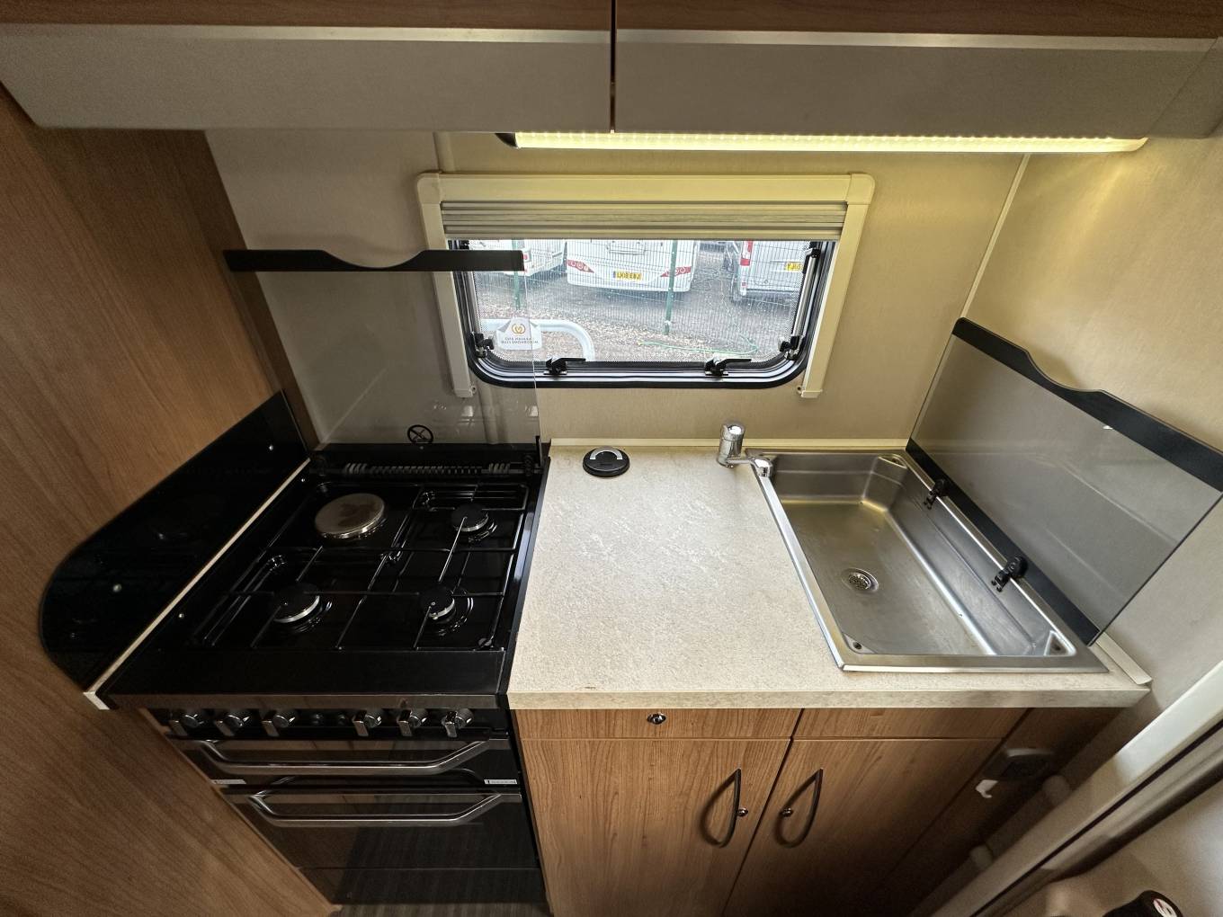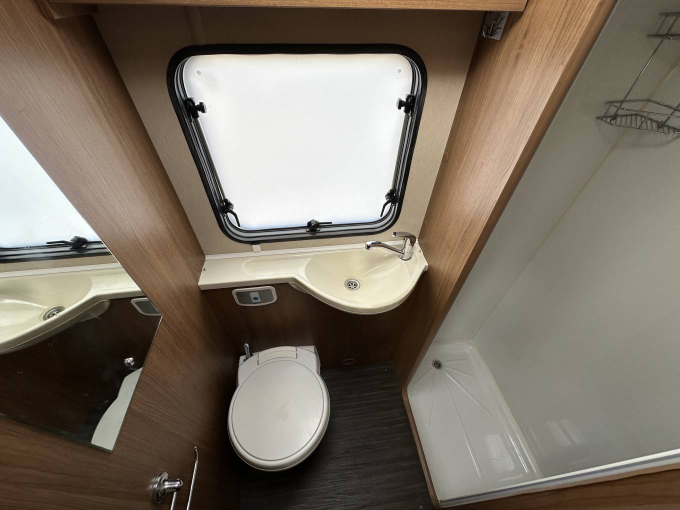 Moving into the kitchen you will find loads of well-lit worktop surface, a three gas burner hob, separate grill and oven and generous designer stainless sink and Dometic combination fridge freezer. Great detailing includes a mains hotplate on the stove, stainless-steel microwave, decent cutlery drawer and pop-up multiple mains sockets. Adjacent is the well appointed corner washroom with separate shower cubicle,Thetford toilet, vanity wash basin with mirror and opaque opening side window.