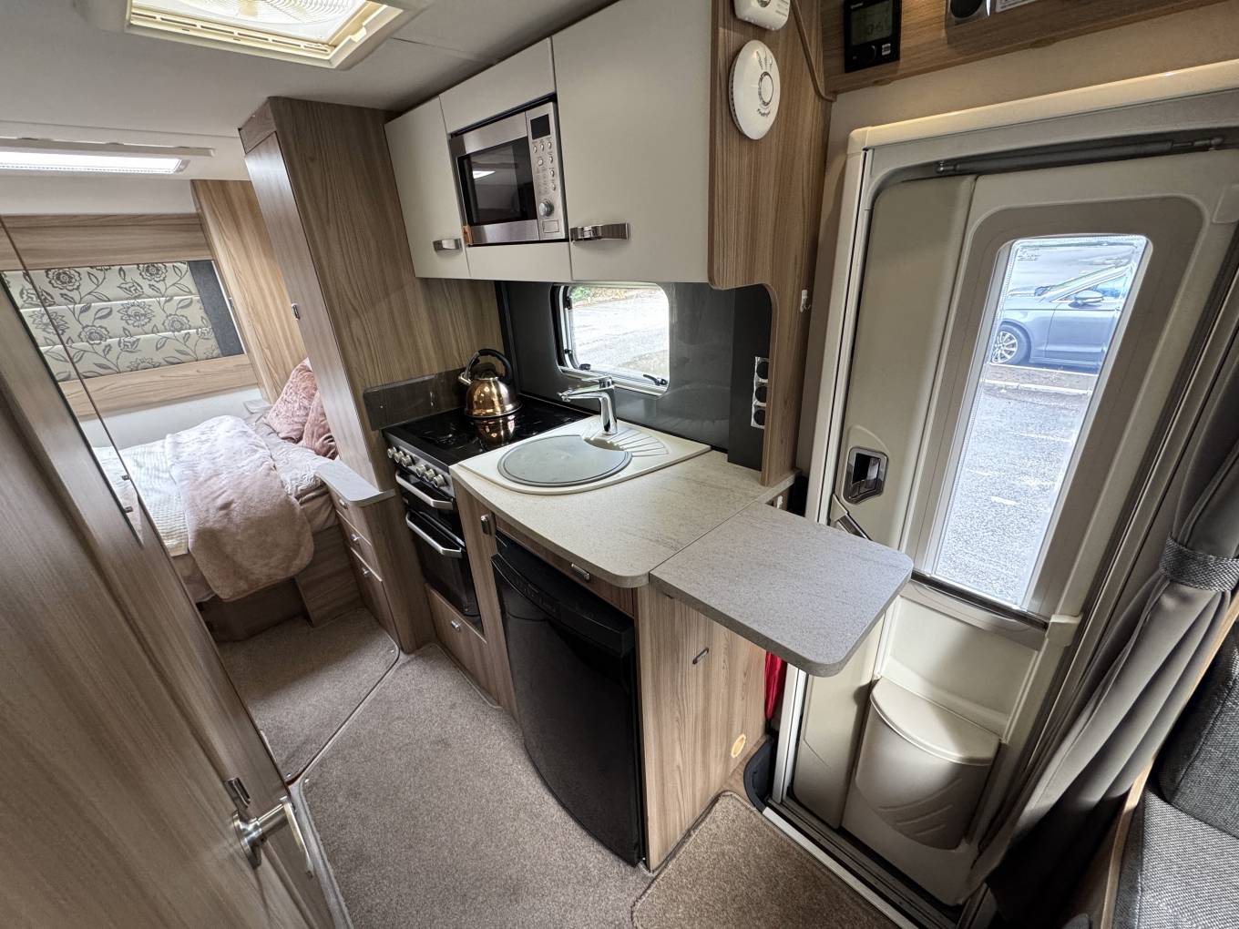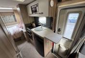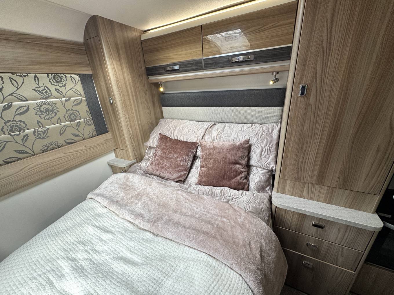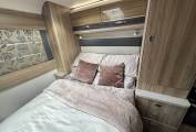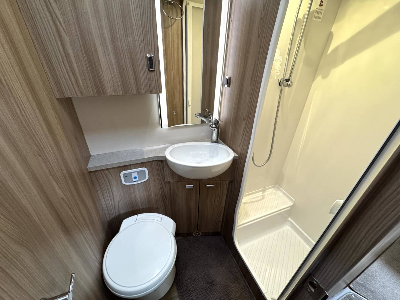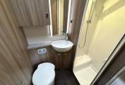 Inside, the Bessacarr 494 offers a well-designed and functional layout. At the rear is a fixed transverse island bed with walk around access and overhead storage, along with wardrobes on either side, providing a good amount of bedroom storage. Just in front of the bedroom is a spacious washroom this houses a separate shower cubicle, cassette toilet, and hand basin.