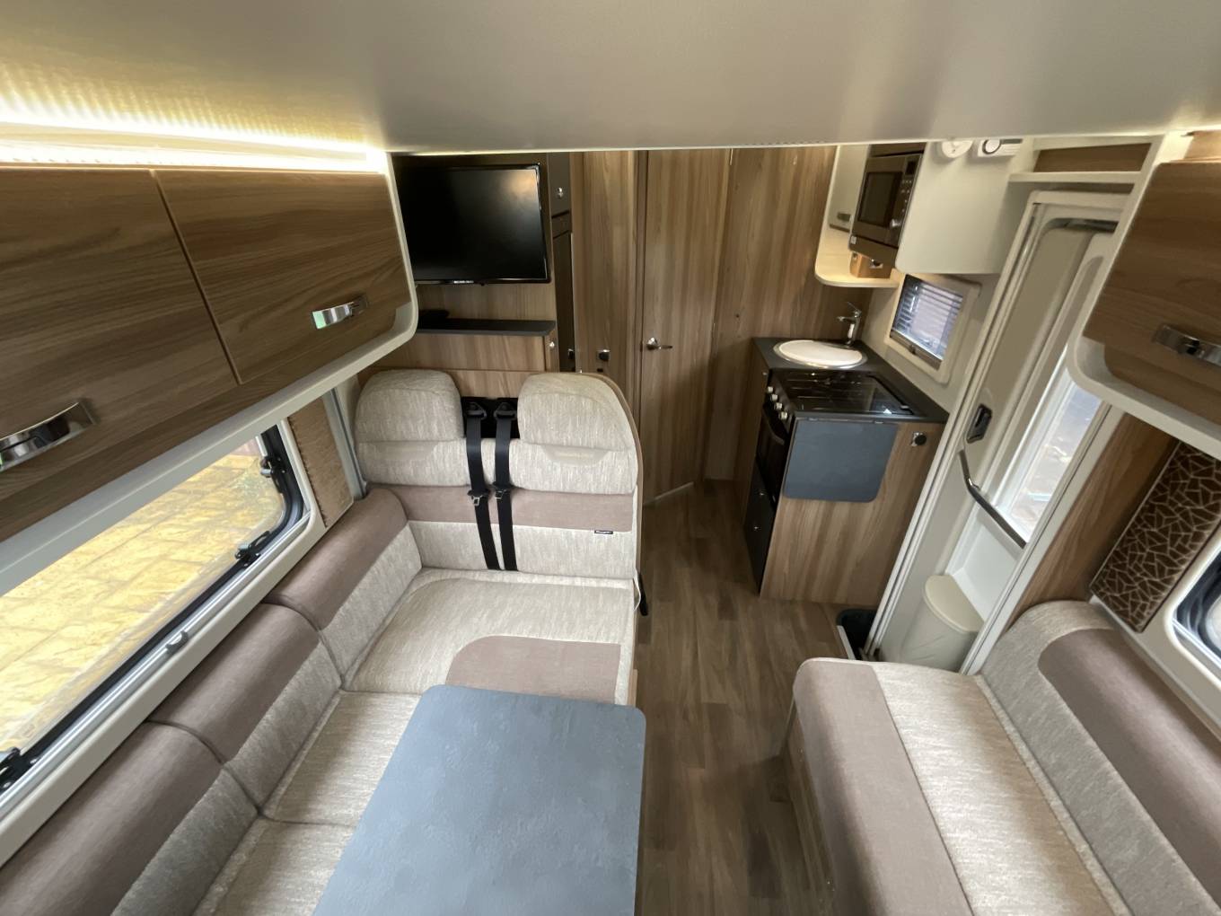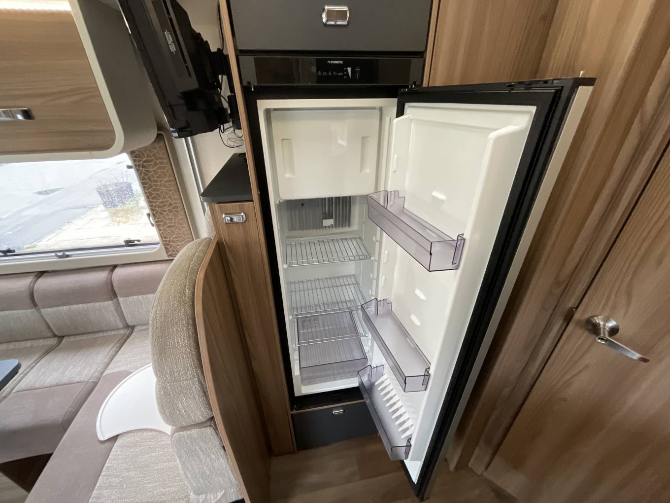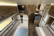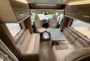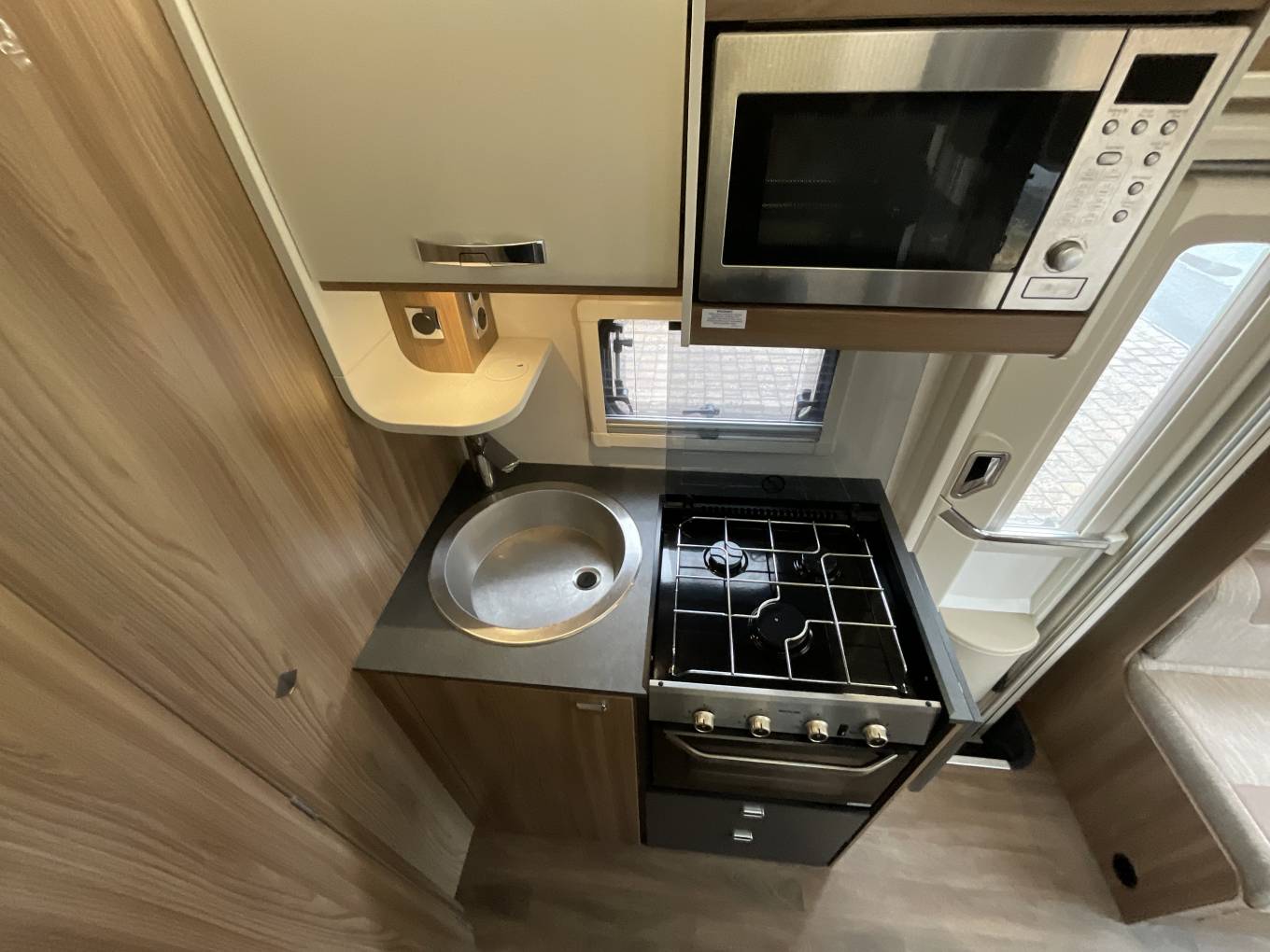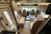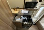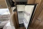 Inside, the Champagne 604C continues to impress with a bright, modern living space. The front lounge benefits from swivel cab seats that integrate seamlessly with the dinette, creating a sociable area that can comfortably seat the whole family. Upholstered in high-quality, modern fabrics, the seating can also be converted into an additional double bed when required, whilst the electric drop down bed provides maximum comfort and convenience. The fully equipped kitchen includes an oven, grill, hob, microwave and a large fridge/freezer, allowing you to prepare meals with ease on the road.