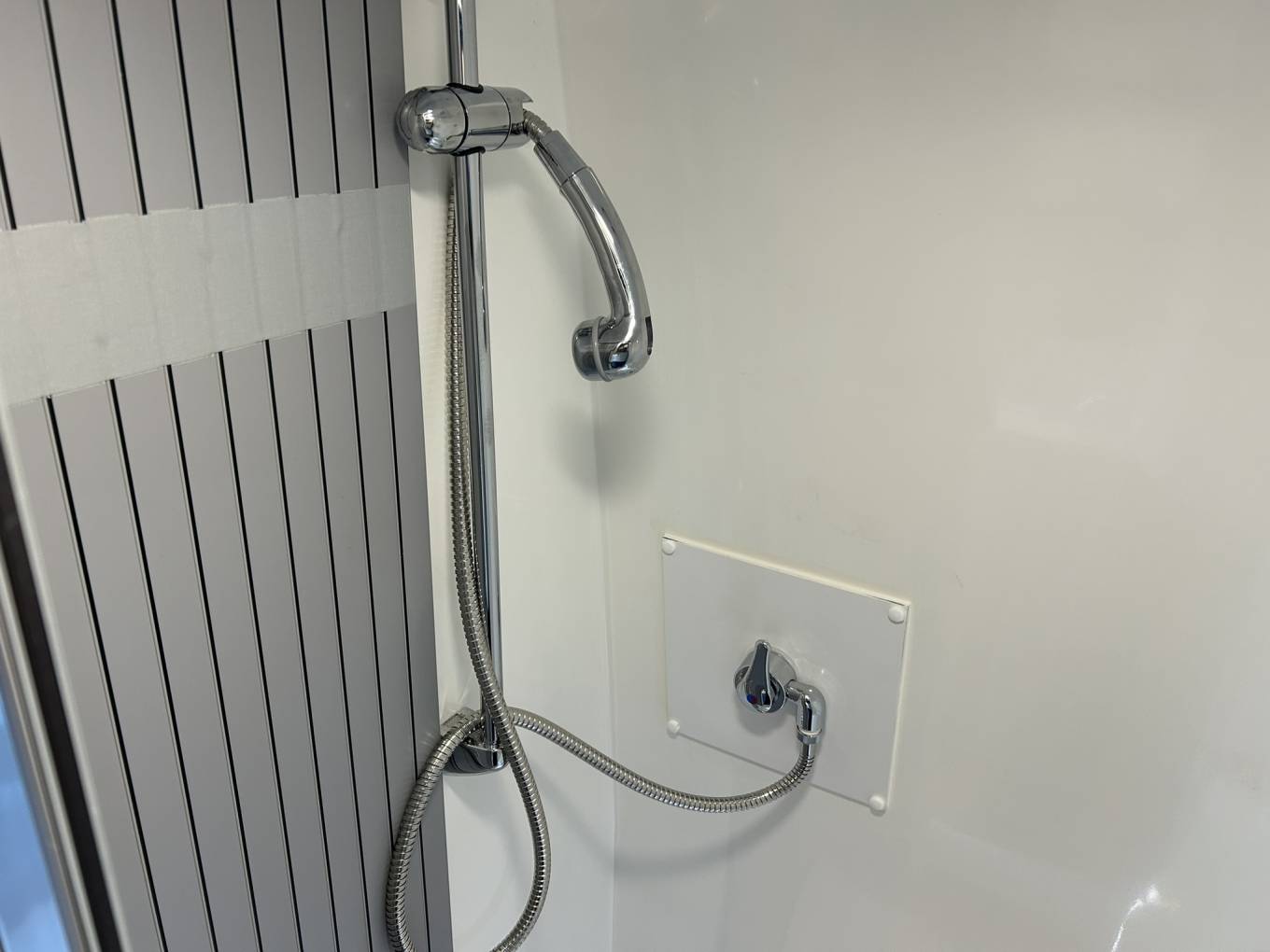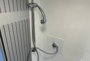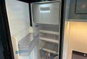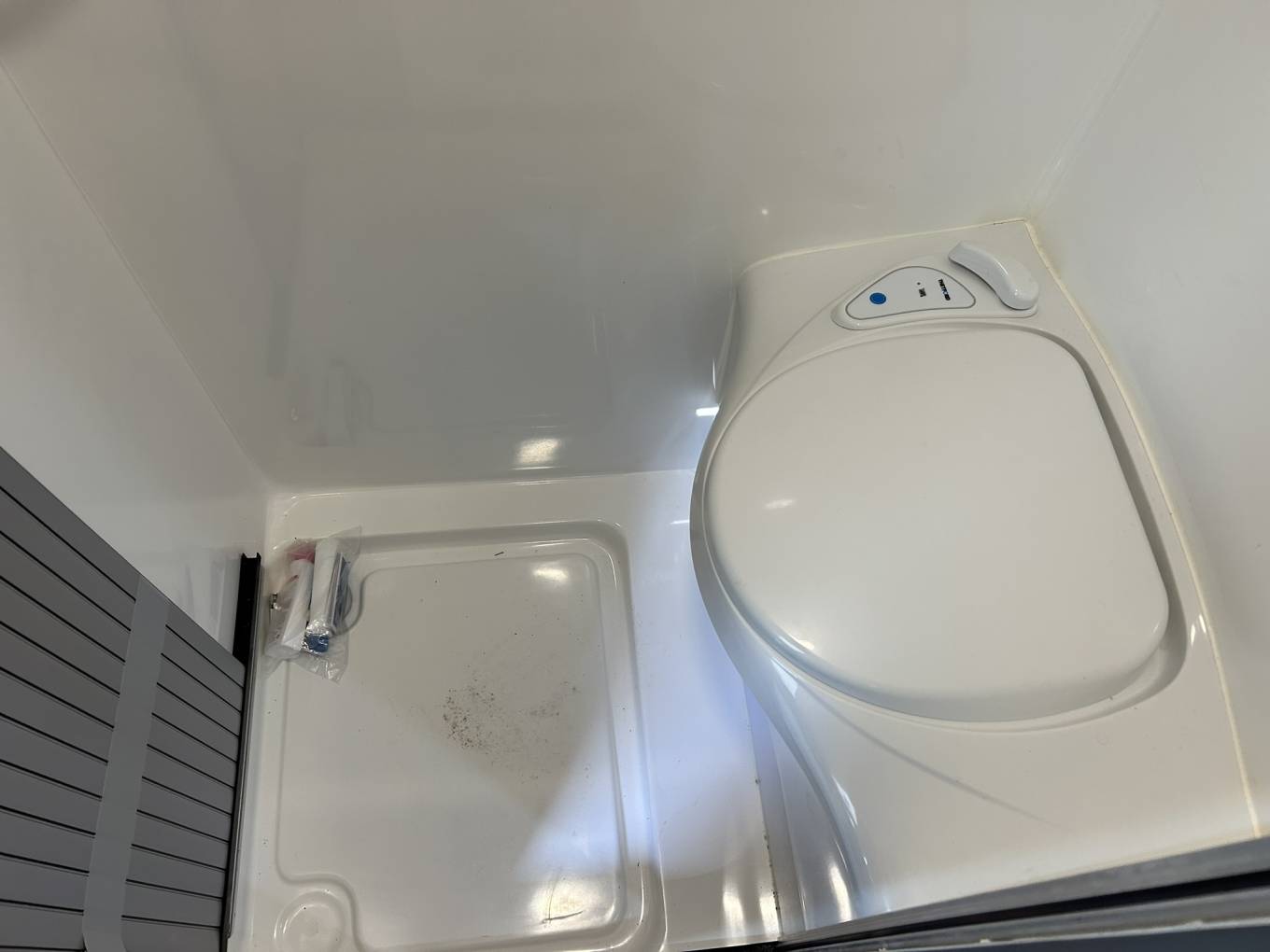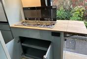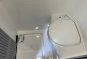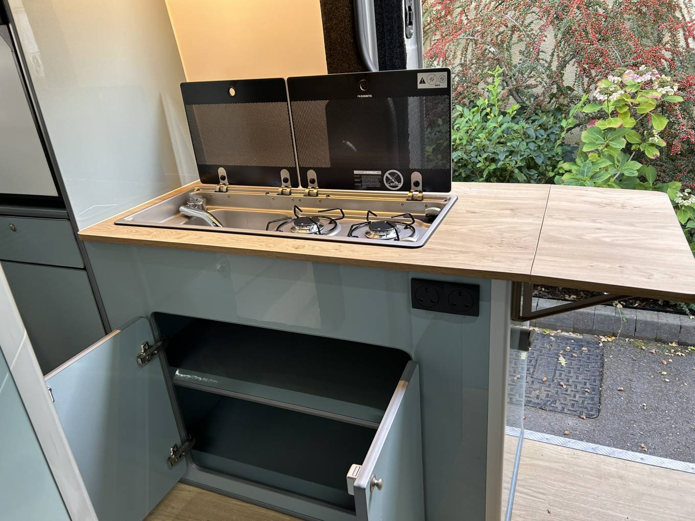 As you enter the van there is an L shaped lounge area that converts easily to a small double bed. Next there is a small kitchen with a fridge, 2 ring gas hob, sink with mixer tap and lots of cupboard and locker space for all you kitchen essentials. Opposite this is a shower with cassette toilet.
