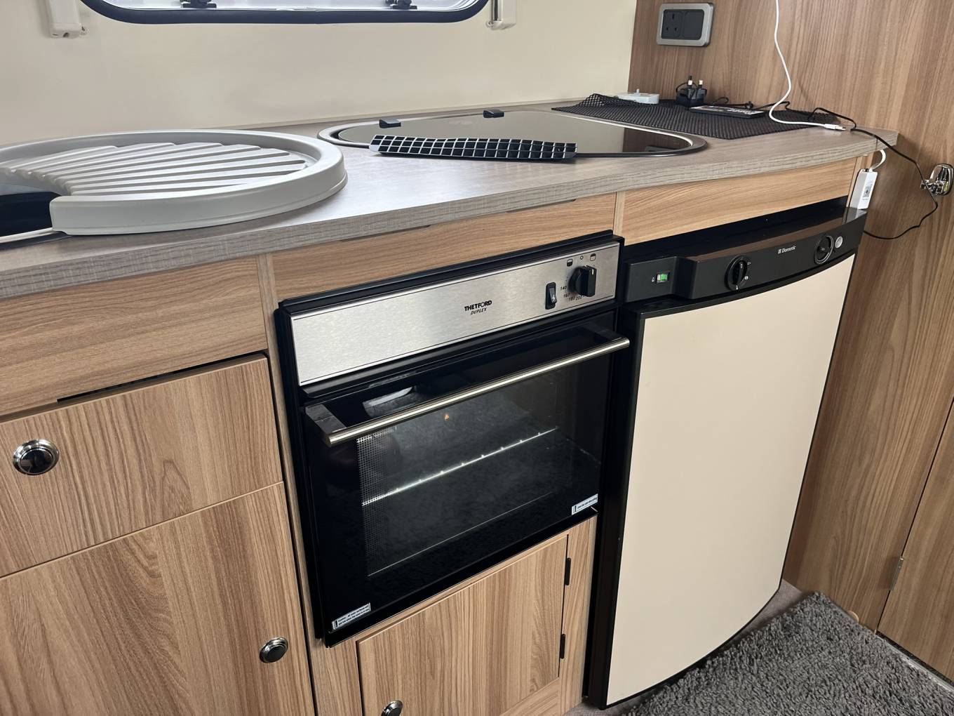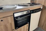 Kitchen - Well laid out kitchen towards the rear with a full-sized oven and grill (3 gas rings). Dometic fridge with freezer compartment. Built In microwave. Plenty of storage with travel safe racks. Removable sink drainer-Lid