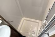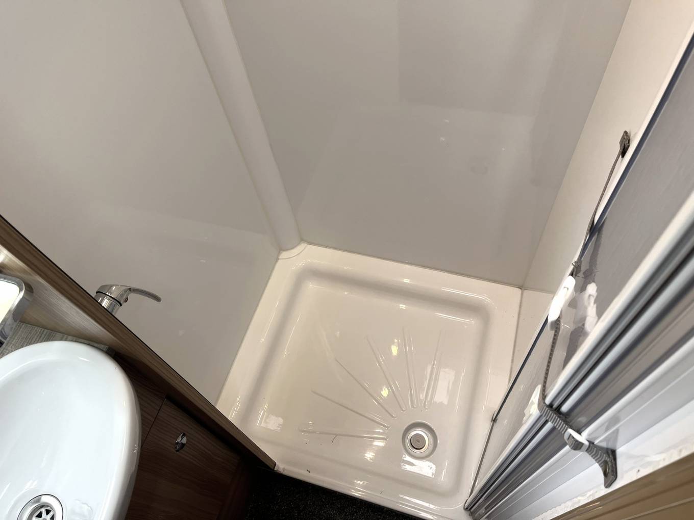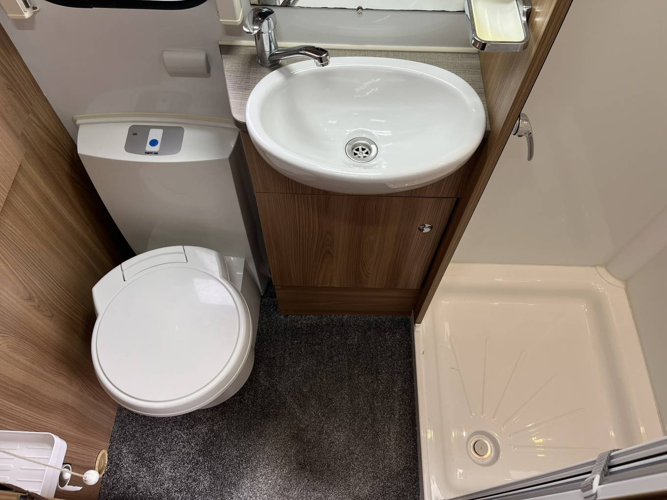 At the rear is the washroom - A deceptively spacious washroom with seperate shower enclosure. Heated Towel Rail.