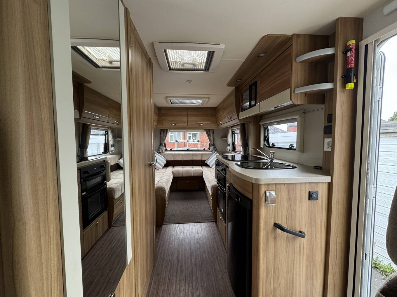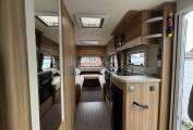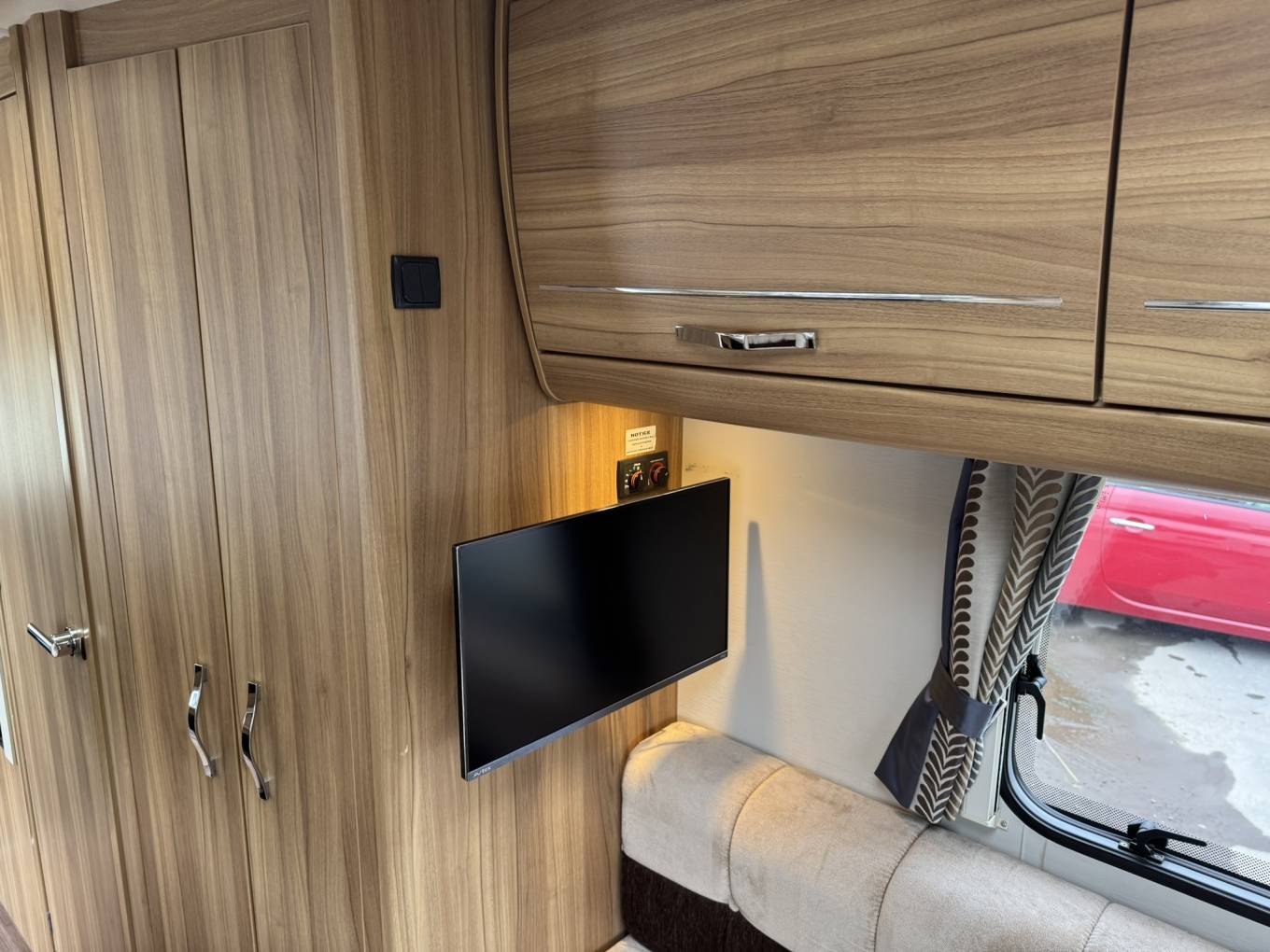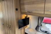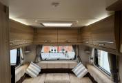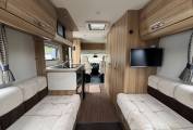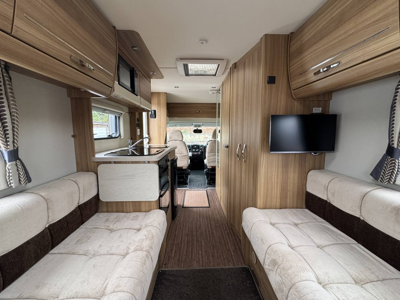 Inside, the lounge easily converts into a comfortable double bed, while the fully equipped kitchen includes a Thetford oven & grill with 3 gas burners, Dometic 3-way fridge, Daewoo microwave, and generous storage. An Avtek TV is fitted for added convenience.