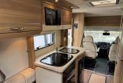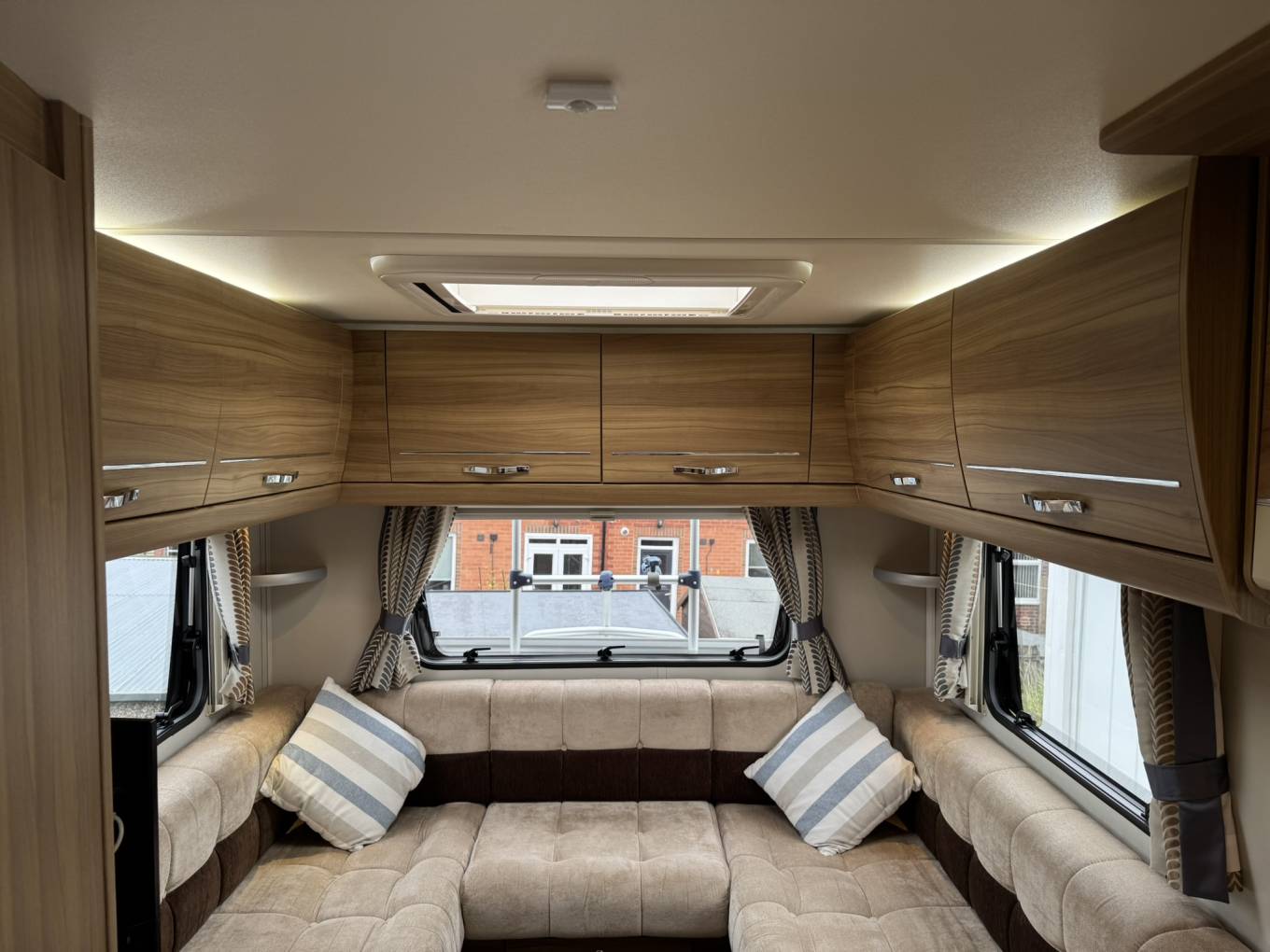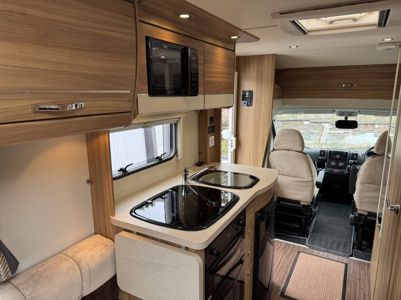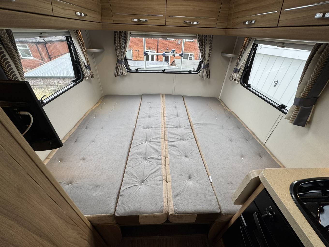 Inside, the lounge easily converts into a comfortable double bed, while the fully equipped kitchen includes a Thetford oven & grill with 3 gas burners, Dometic 3-way fridge, Daewoo microwave, and generous storage. An Avtek TV is fitted for added convenience.